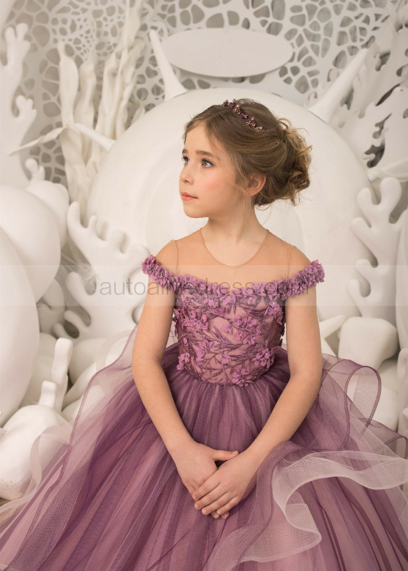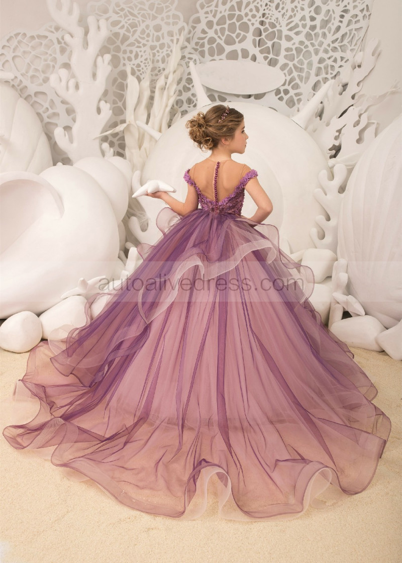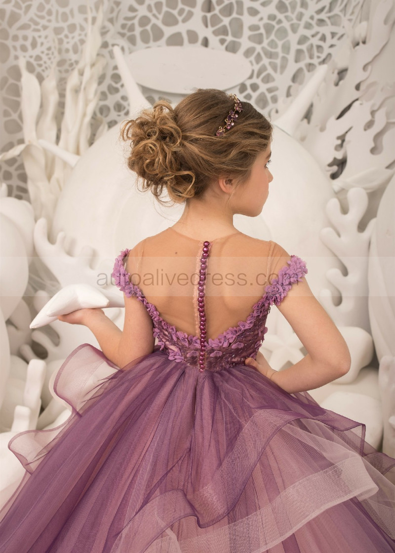 Beaded Purple Tulle Floor Length Horsehair Hem Flower Girl Dress