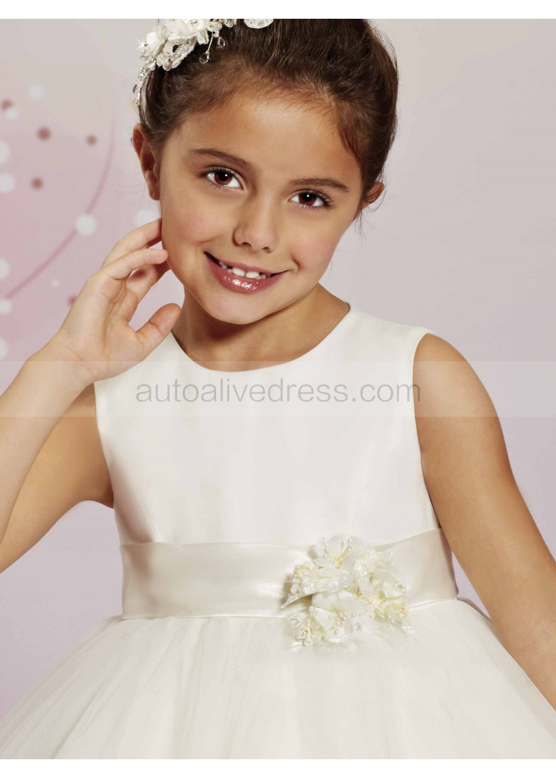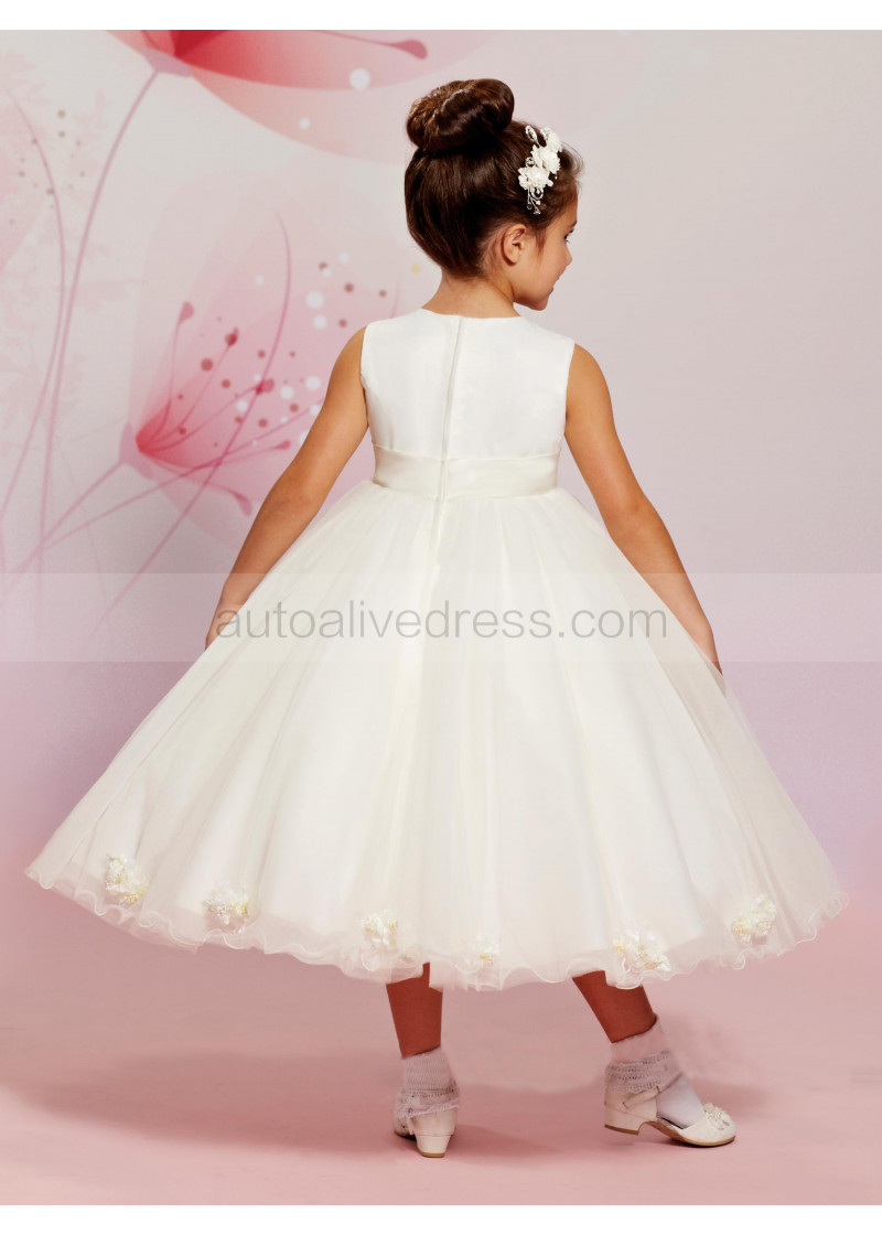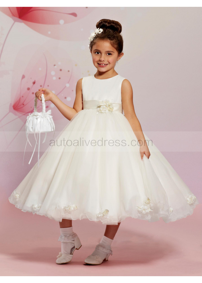 Ivory Satin Tulle Tea Length Curly Hem Flower Girl Dress Wedding Party Dress