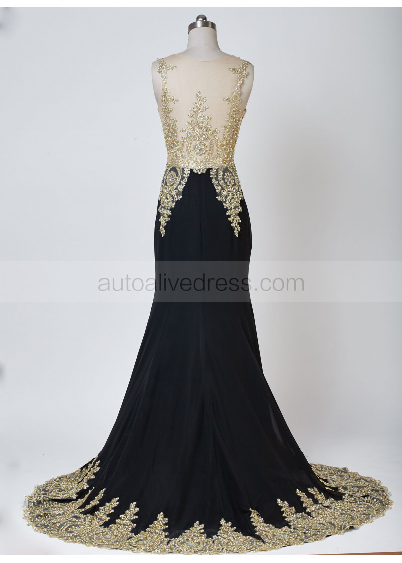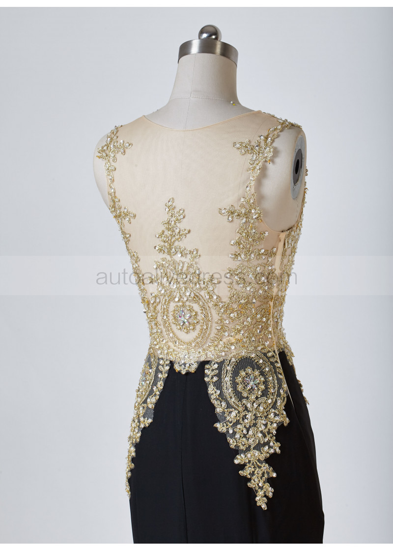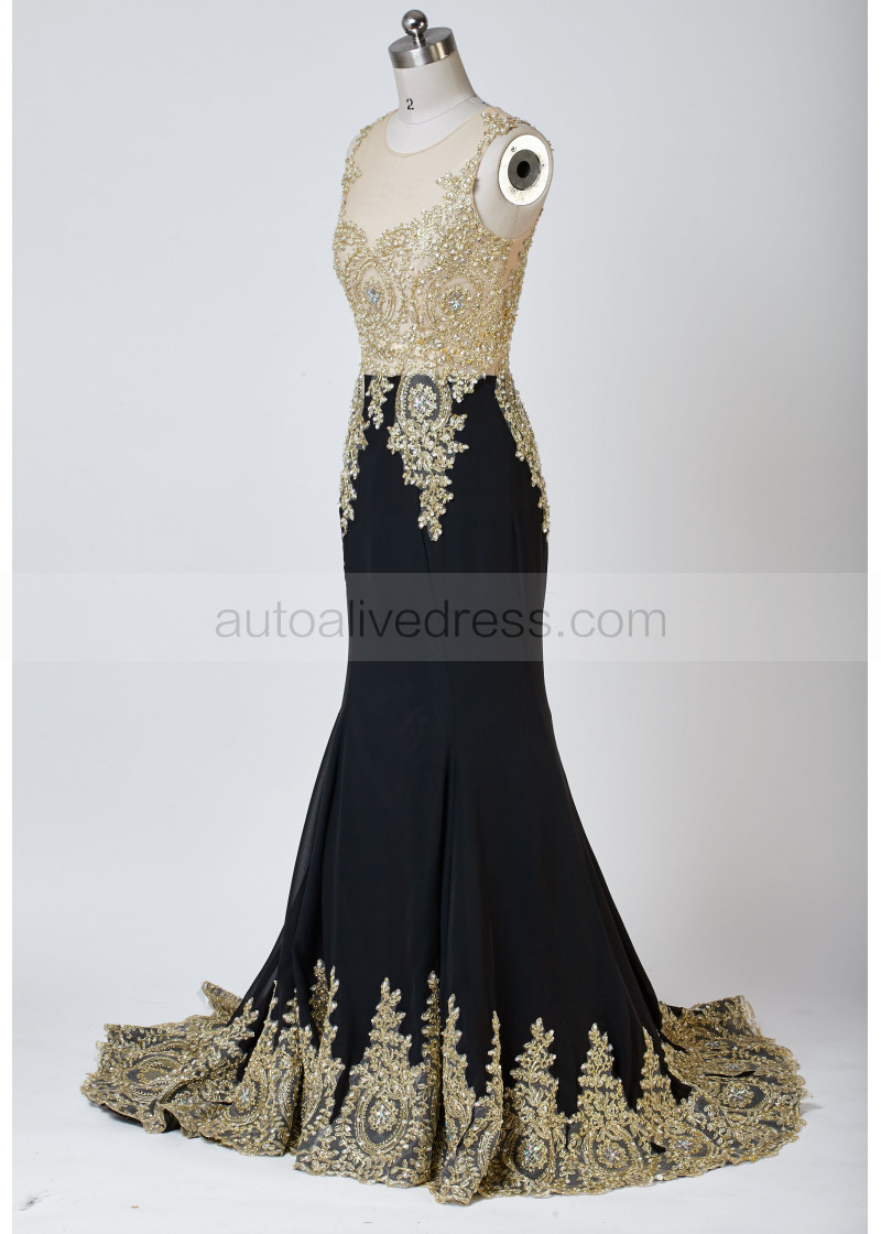 Mermaid Sheer Neckline Gold Lace Black Chiffon Beading Long Prom Dress