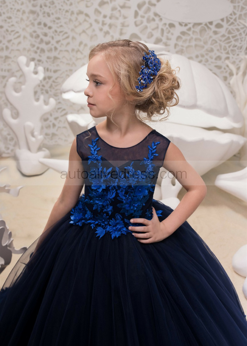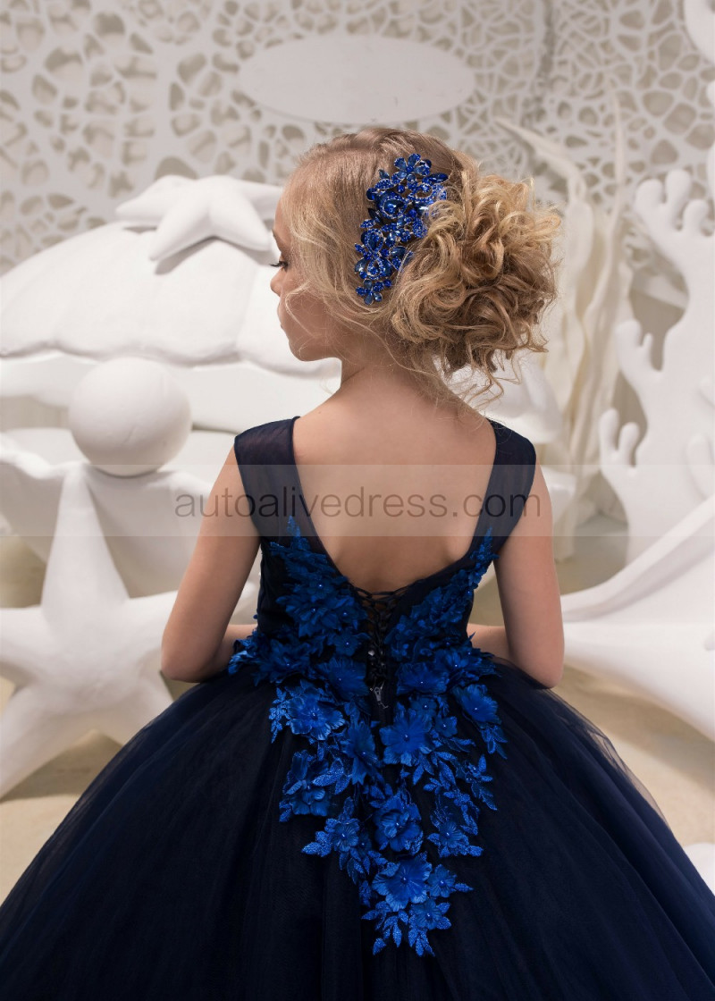 Navy Blue Beaded Lace Tulle Long Flower Girl Dress Pageant Dress