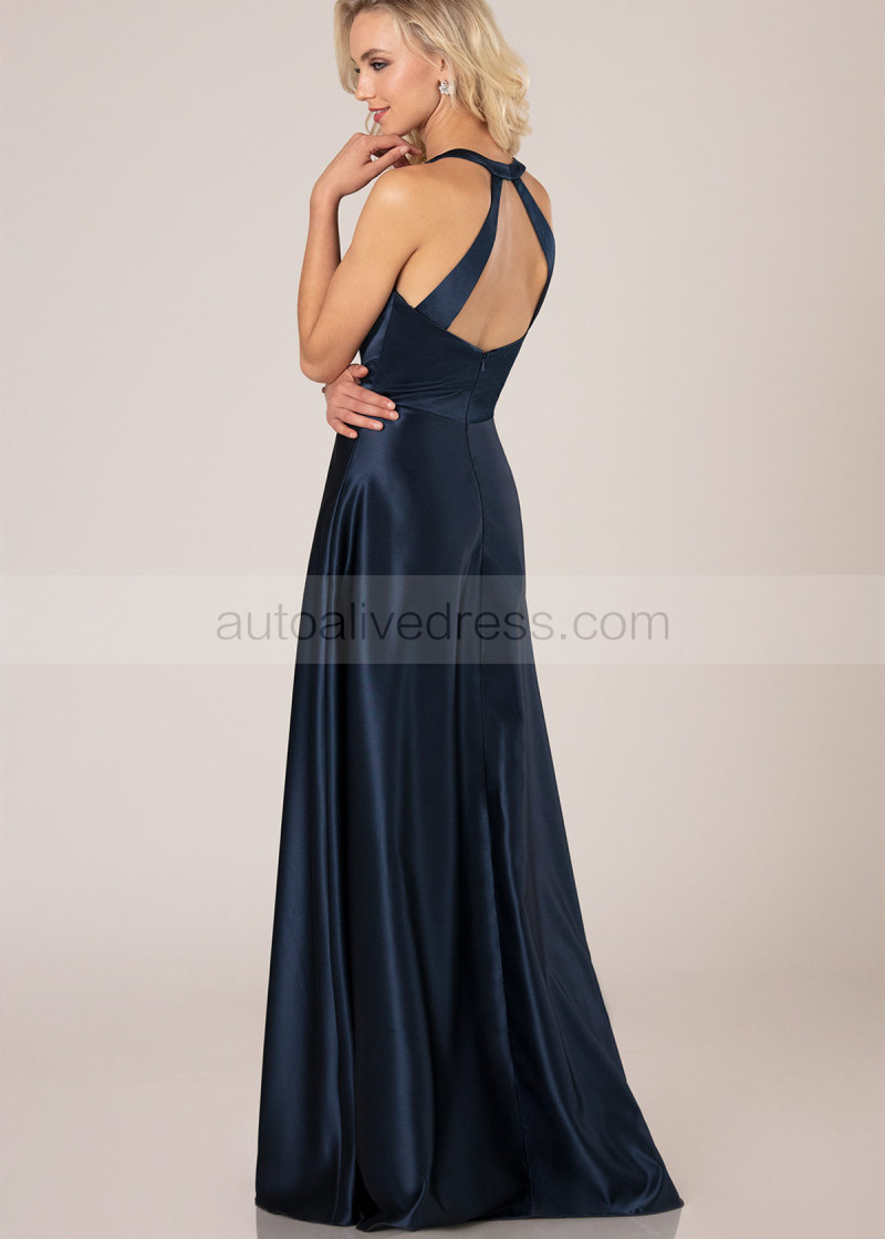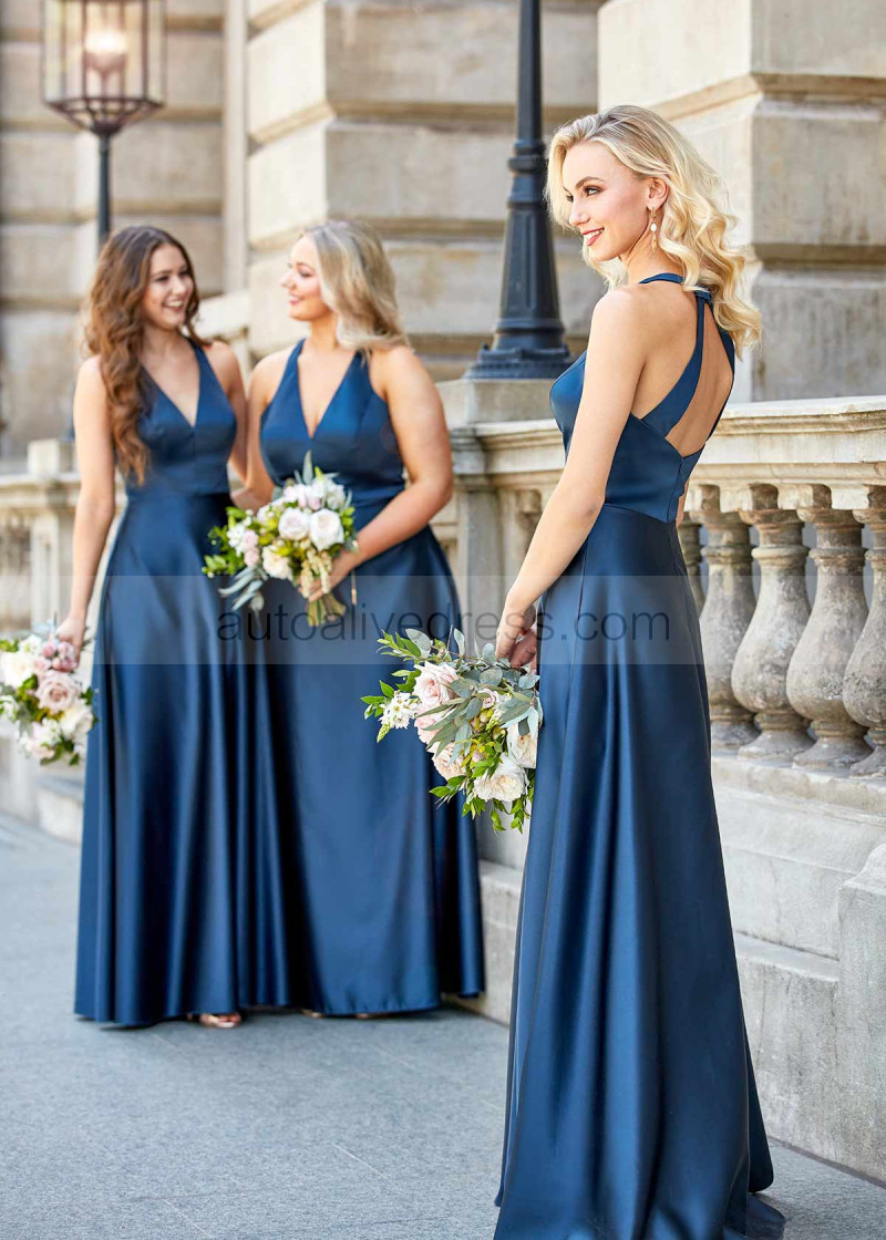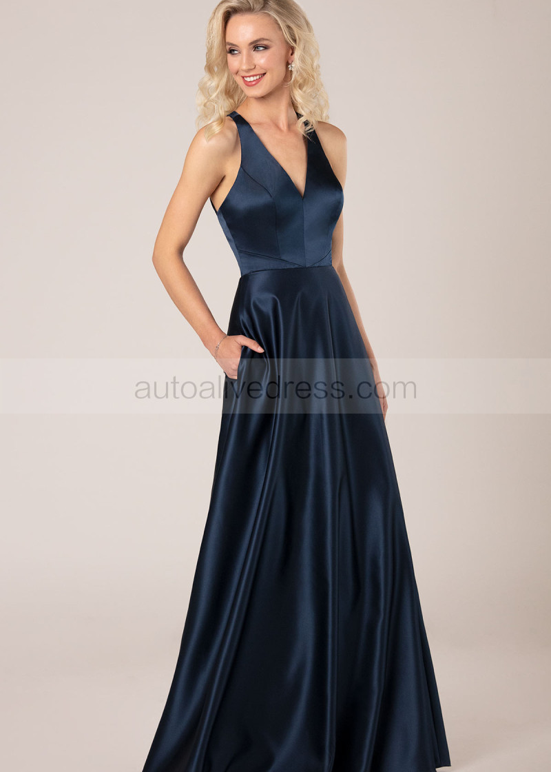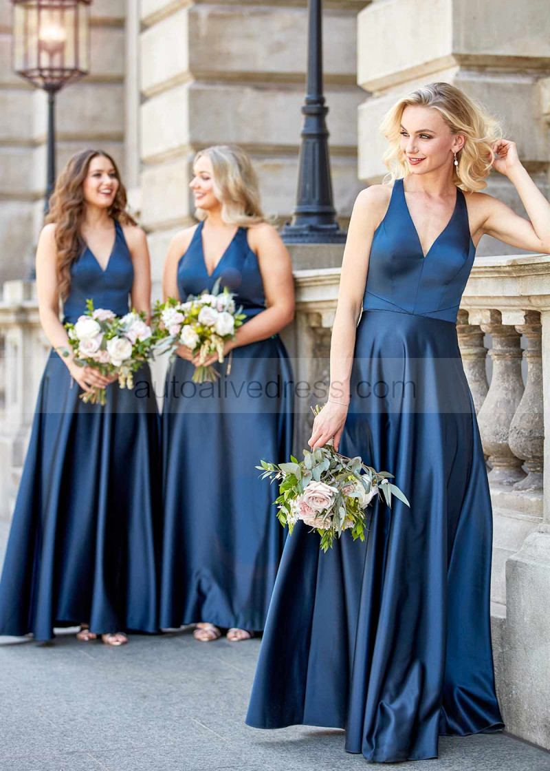 V Neck Navy Blue Satin Bridesmaid Dress