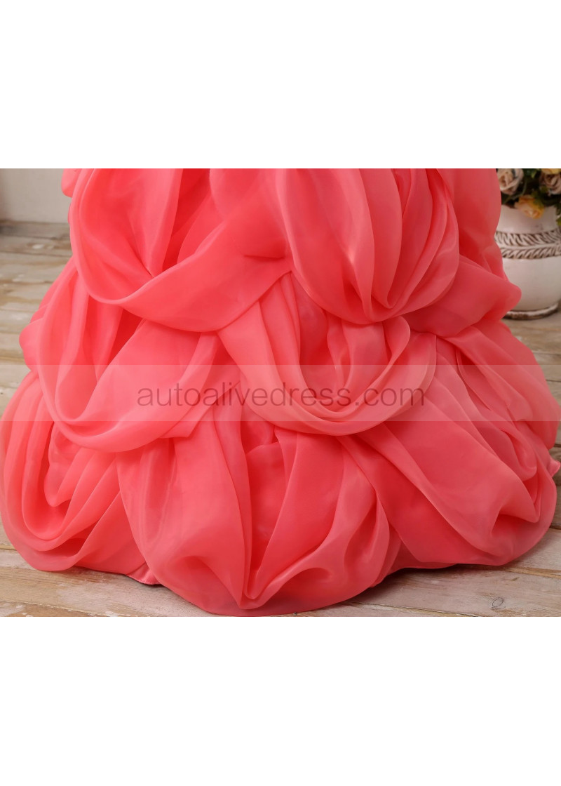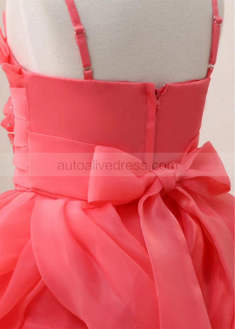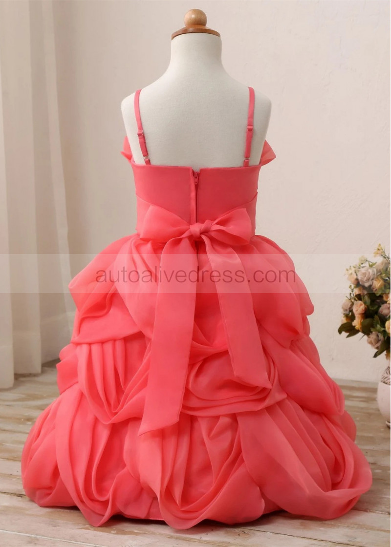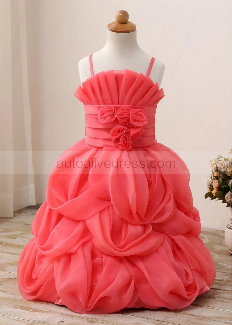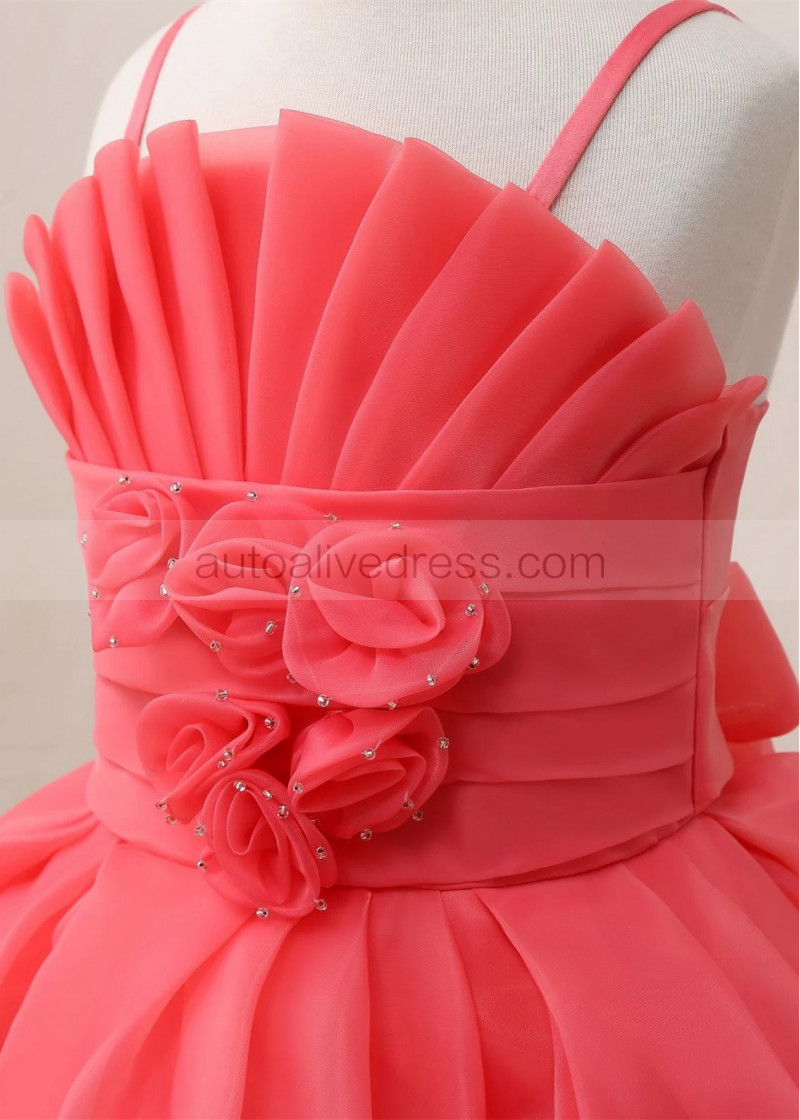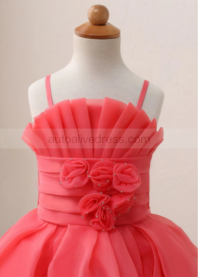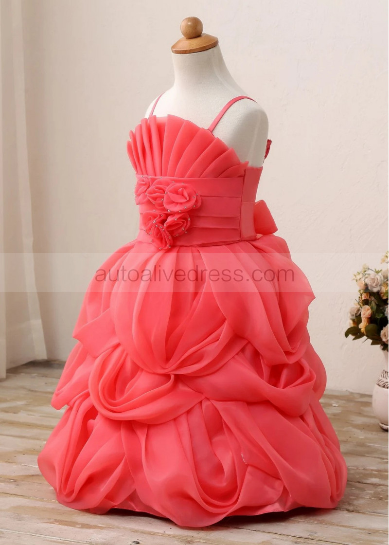 Adjustable Straps Beaded Coral Organza Satin Flower Girl Dress