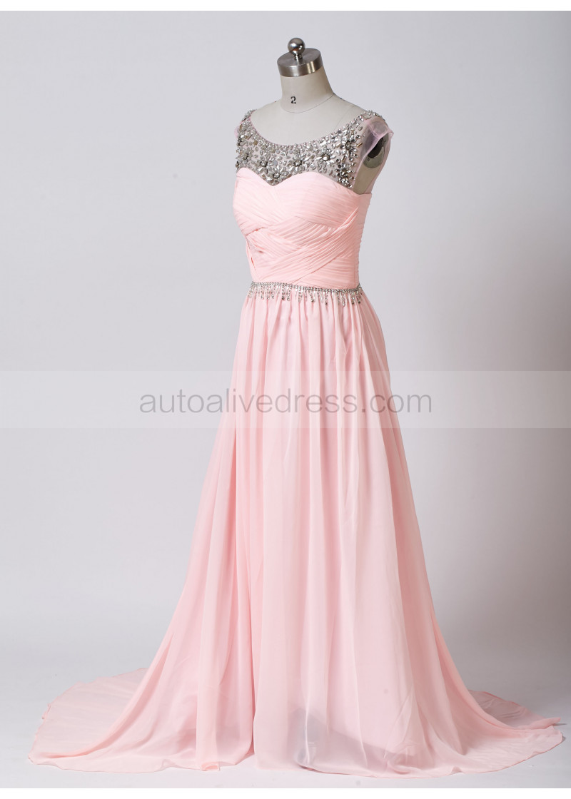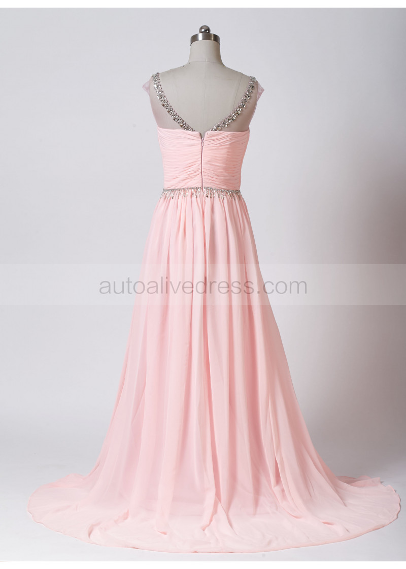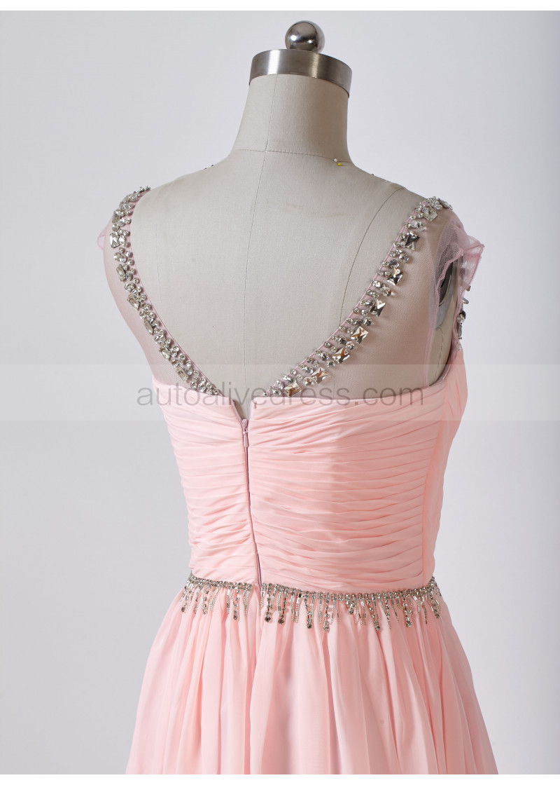 Beaded Blush Pink Ruched Chiffon V Back Prom Dress
