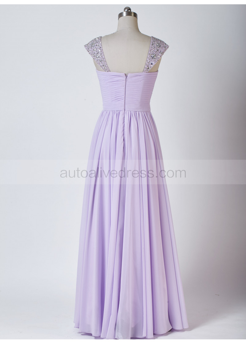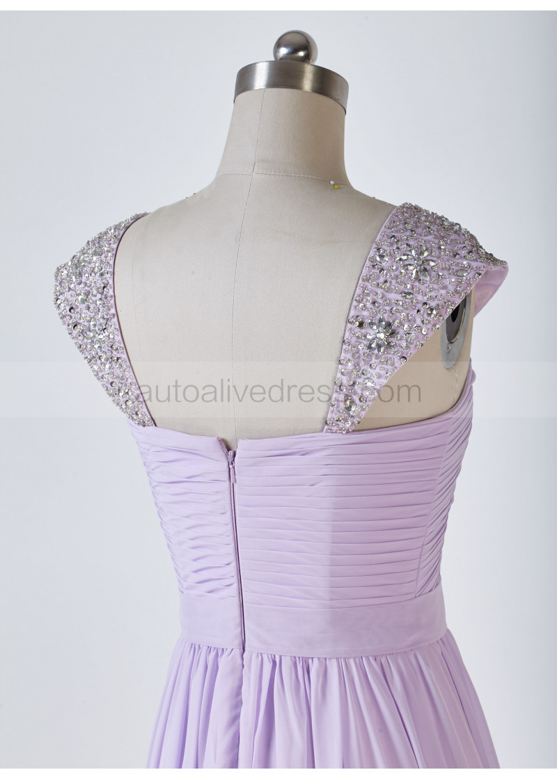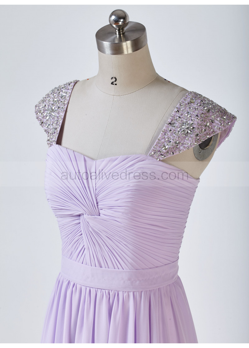 Beaded Cap Sleeves Lavender Chiffon Pleated Bridesmaid Dress