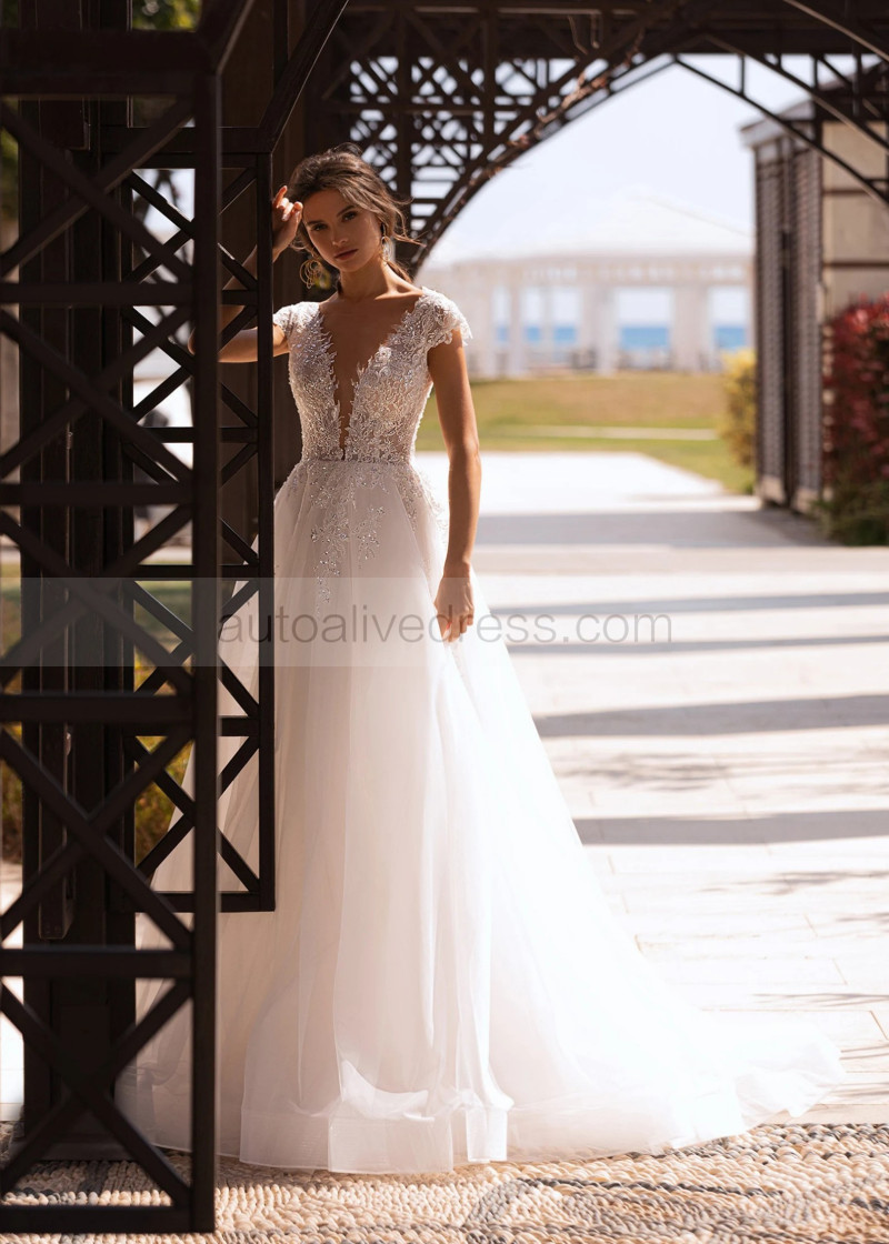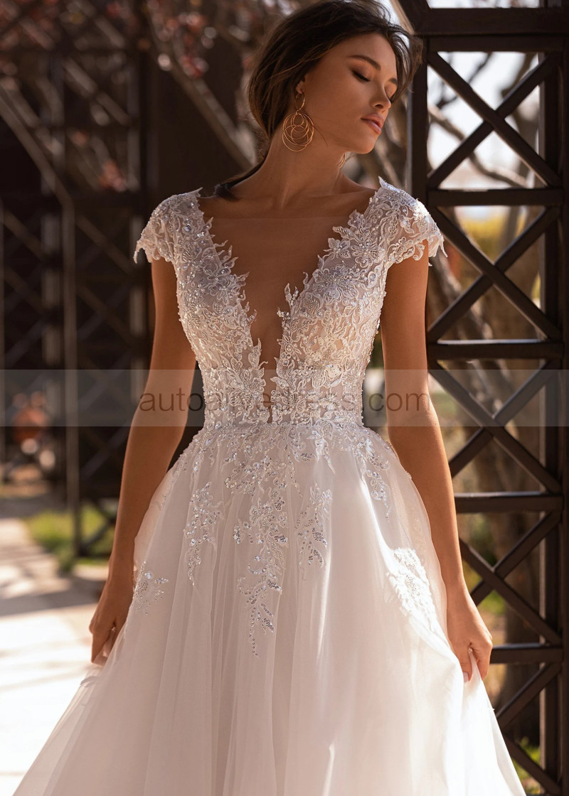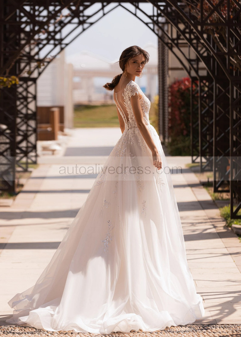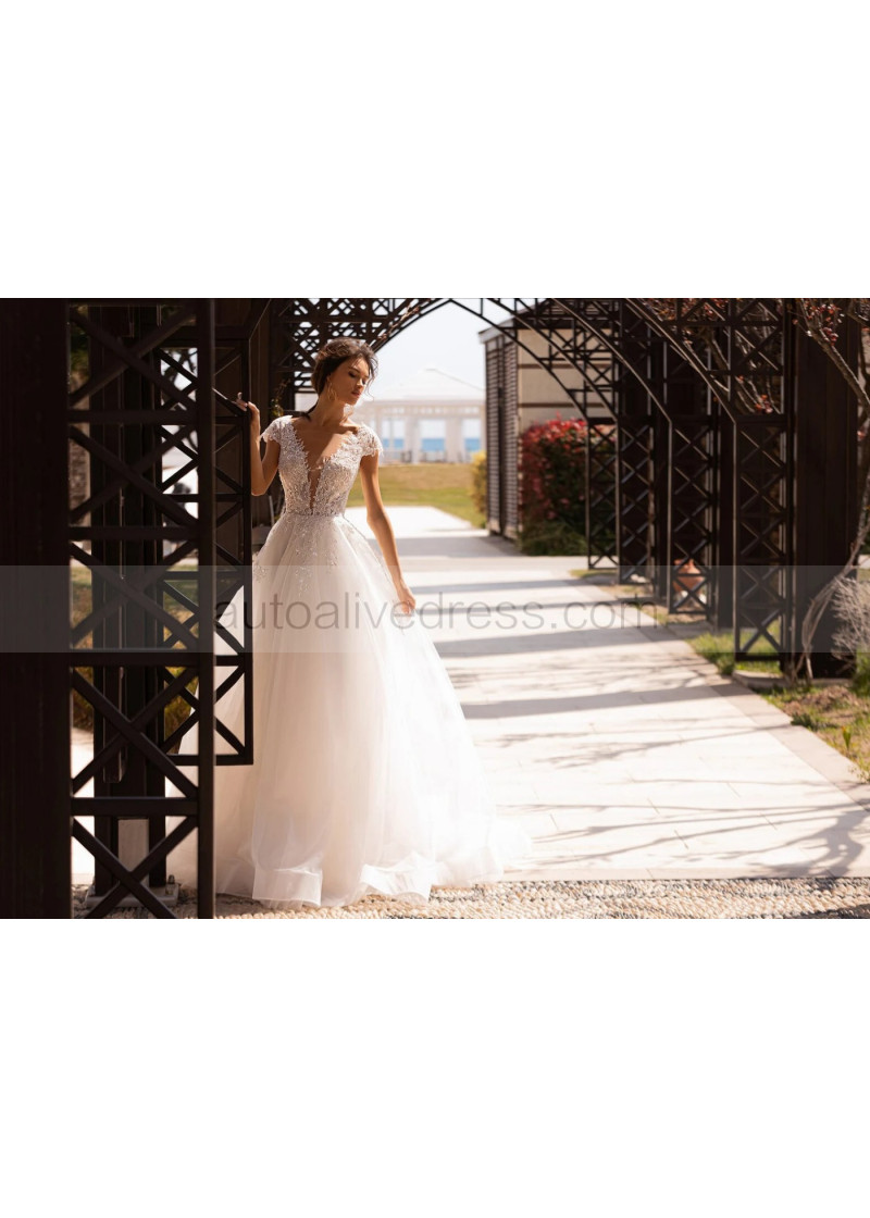 Beaded Ivory Floral Lace Tulle Buttons Back Fairytale Wedding Dress