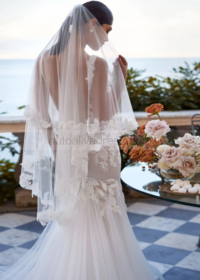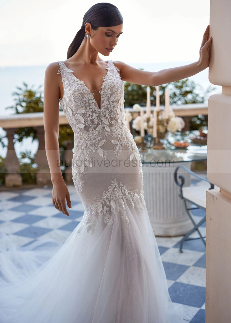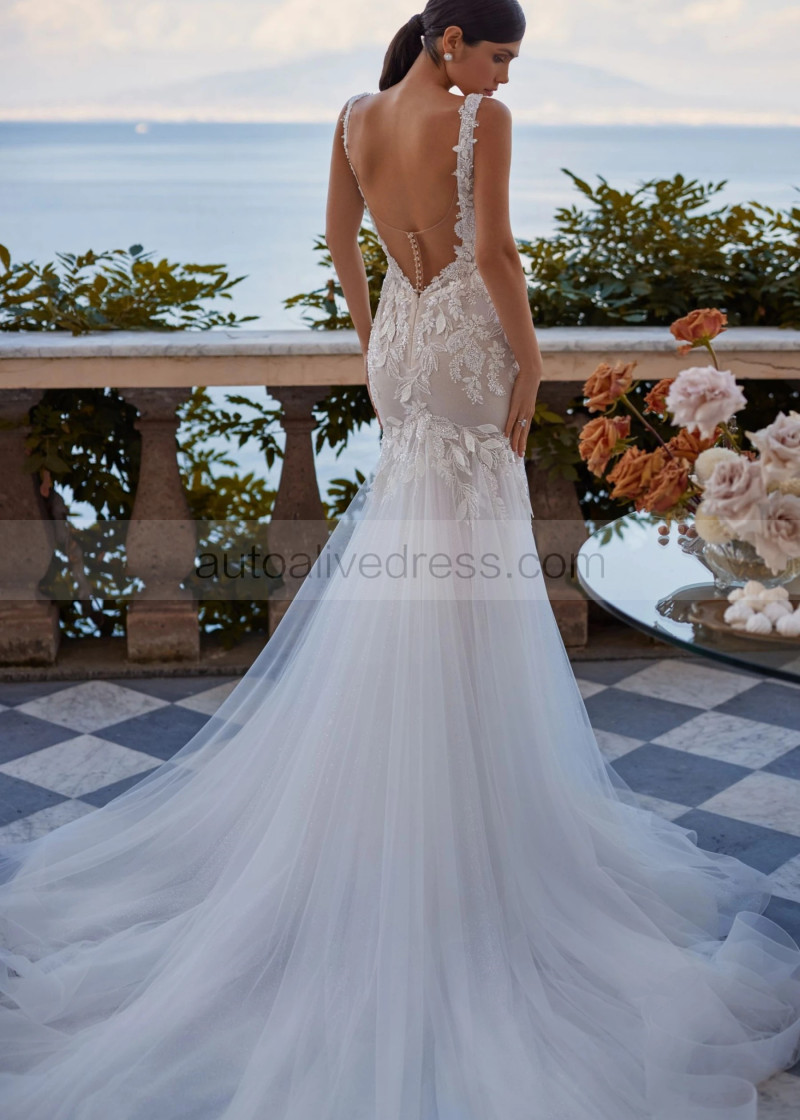 Beaded Ivory Lace Glitter Tulle Open Back Sexy Wedding Dress