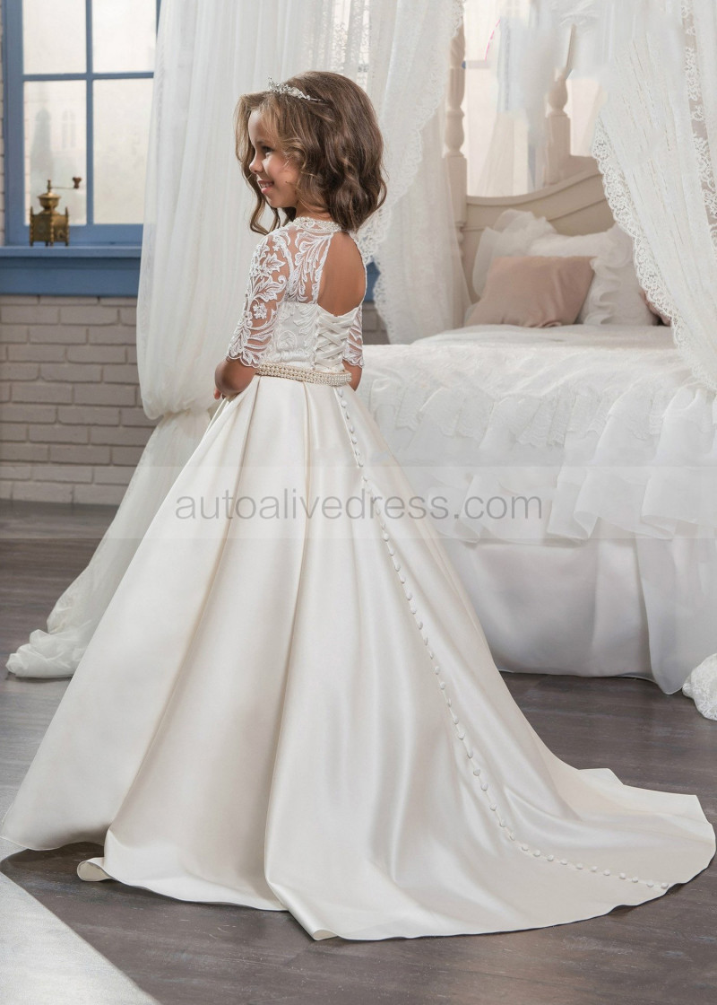 Beaded Ivory Lace Satin Keyhole Corset Back Long Flower Girl Dress