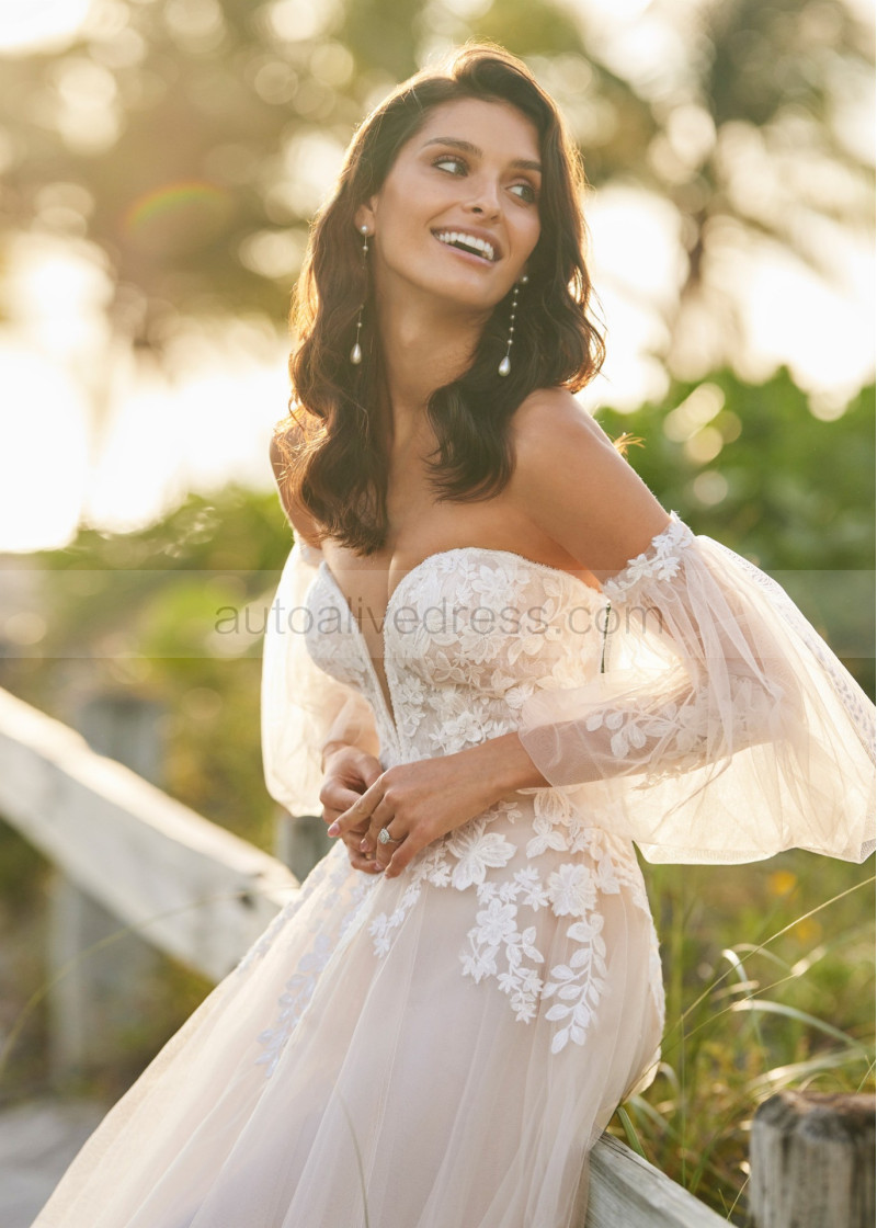 Beaded Ivory Lace Tulle Corset Back Wedding Dress With Detachable Sleeves