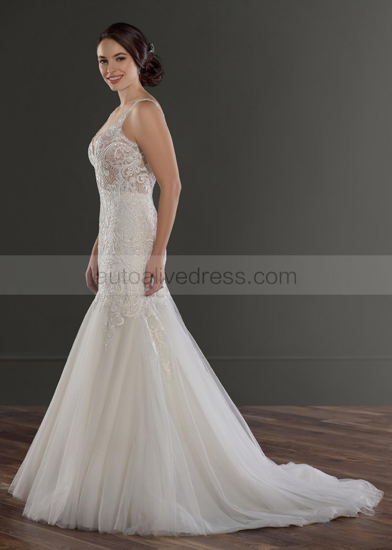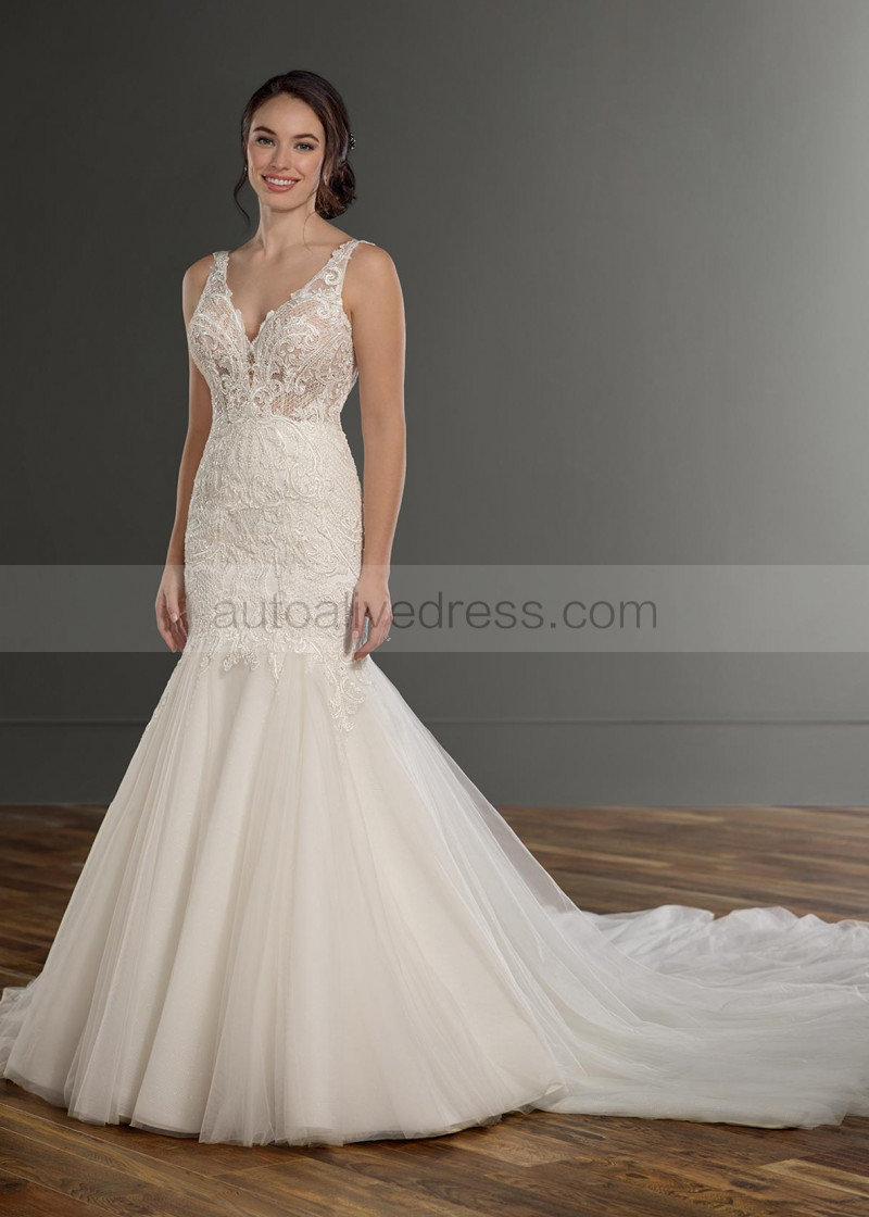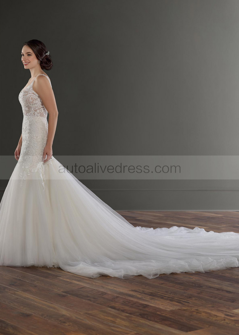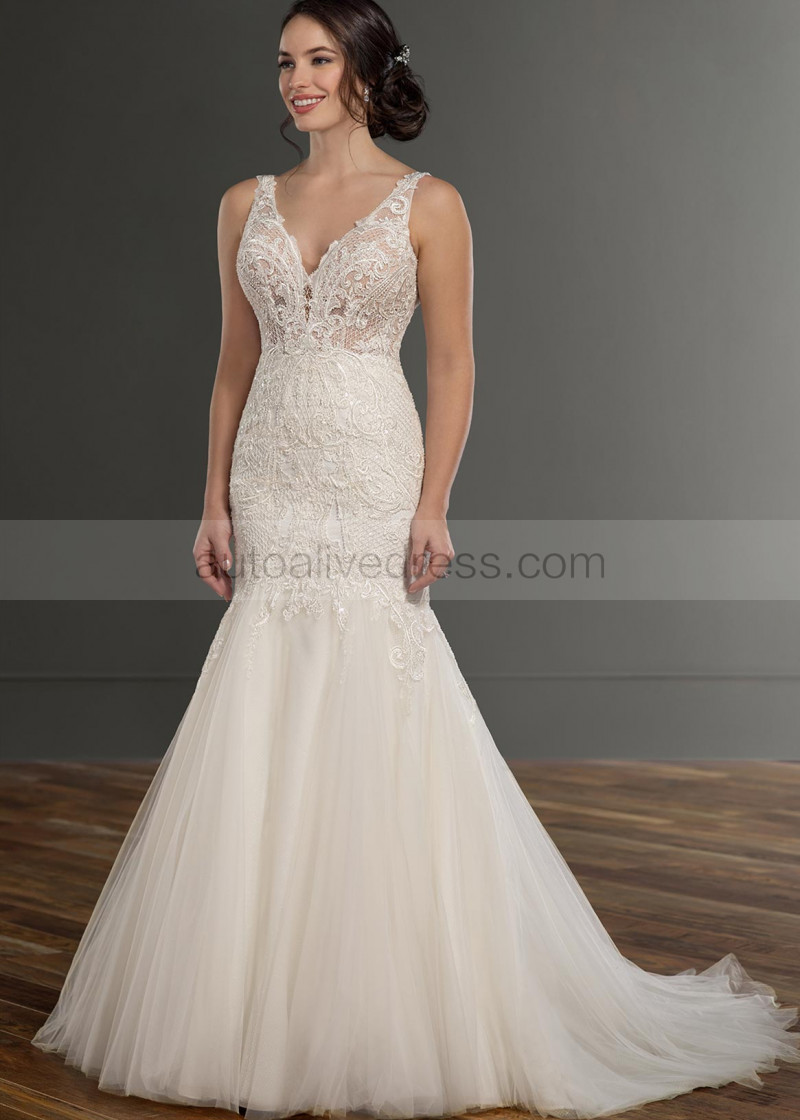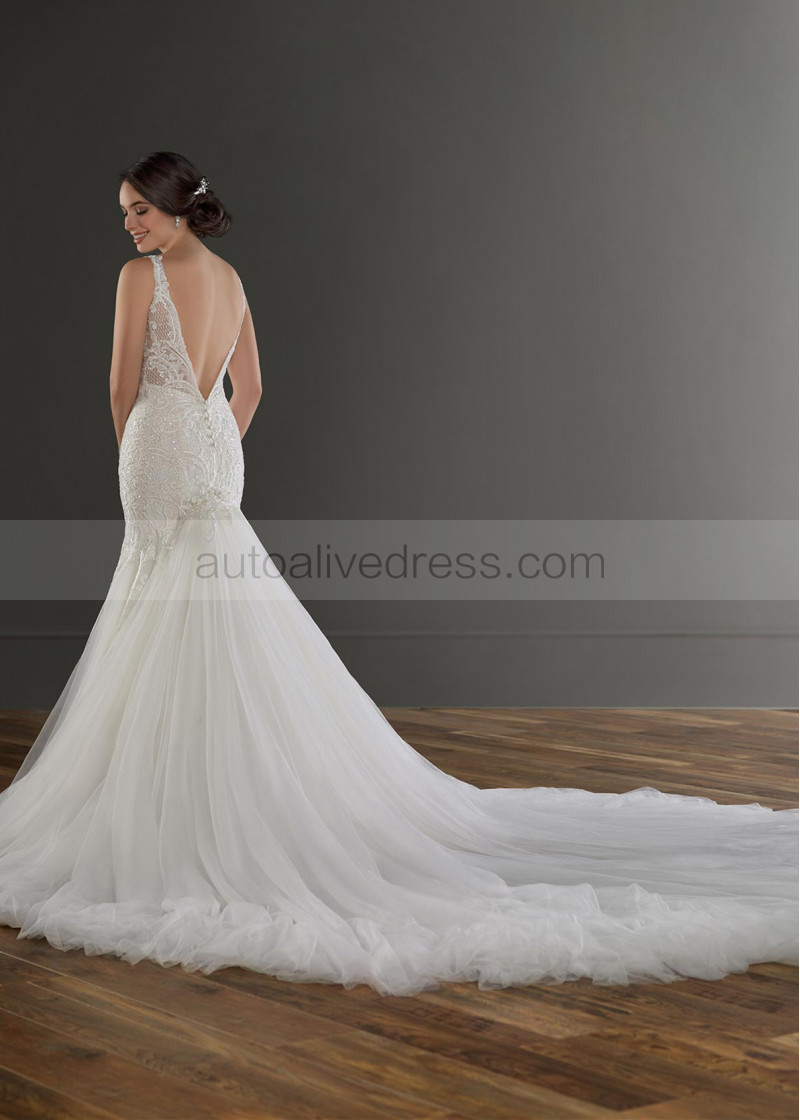 Beaded Ivory Lace Tulle Deep V Back Wedding Dress