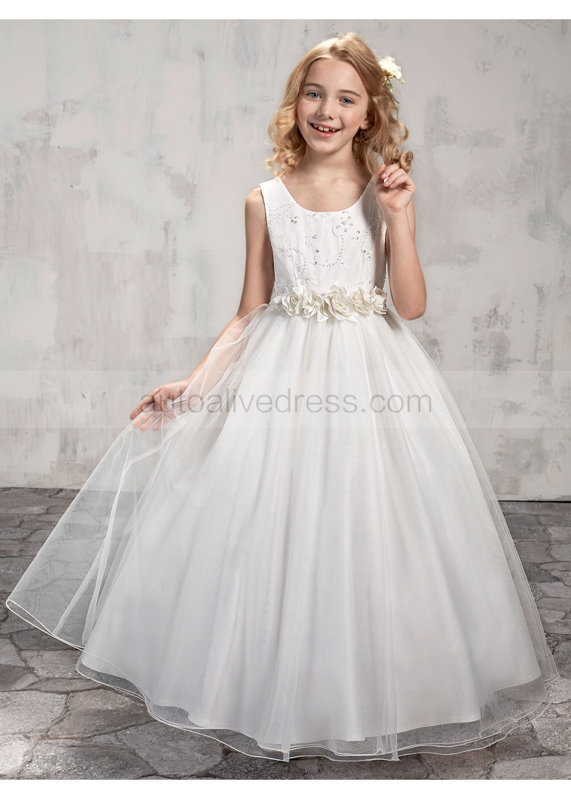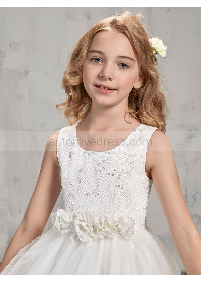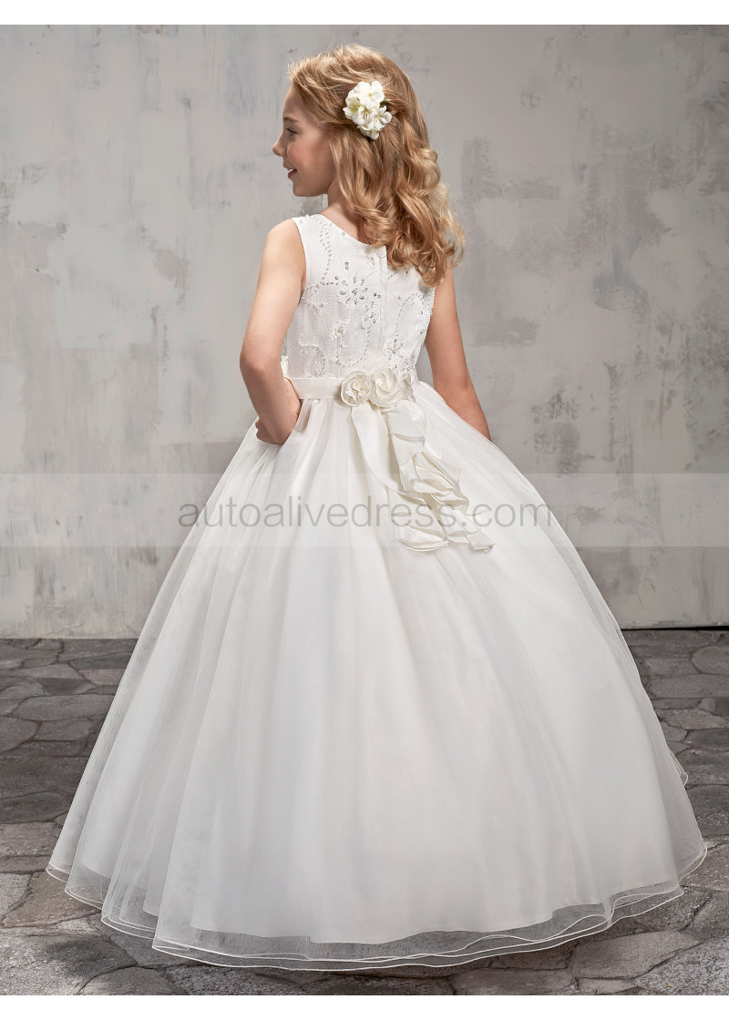 Beaded Ivory Lace Tulle Flower Girl Dress With Handmade Flower Sash