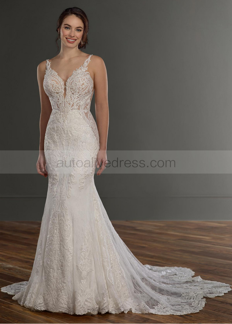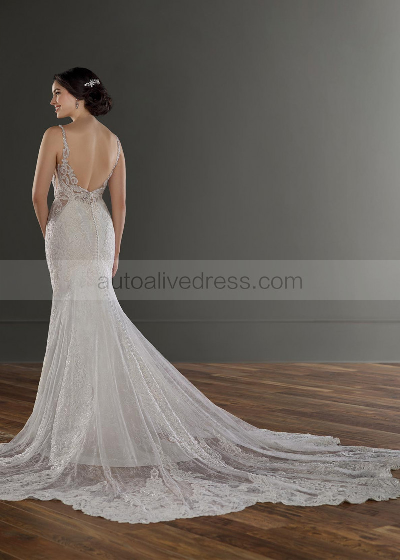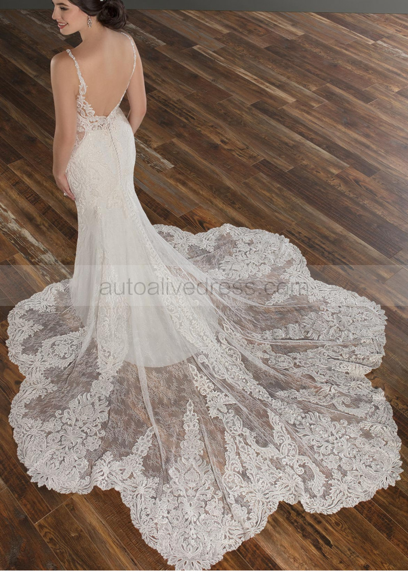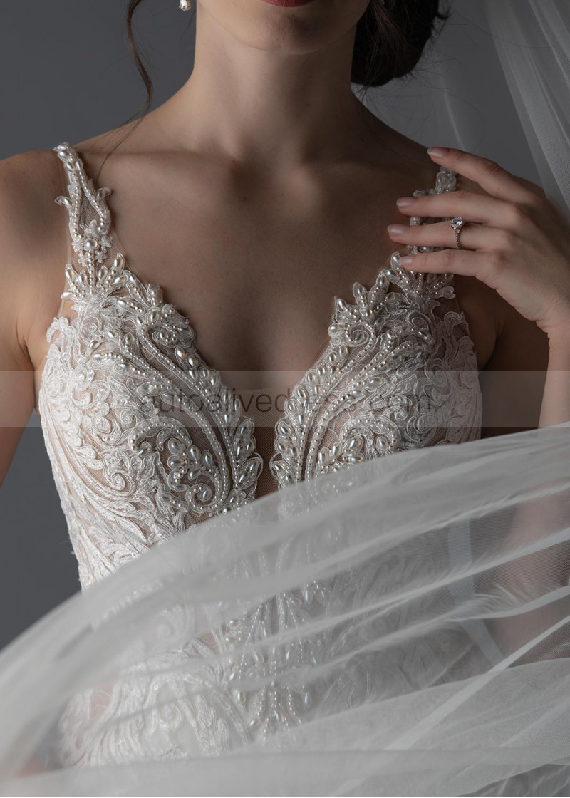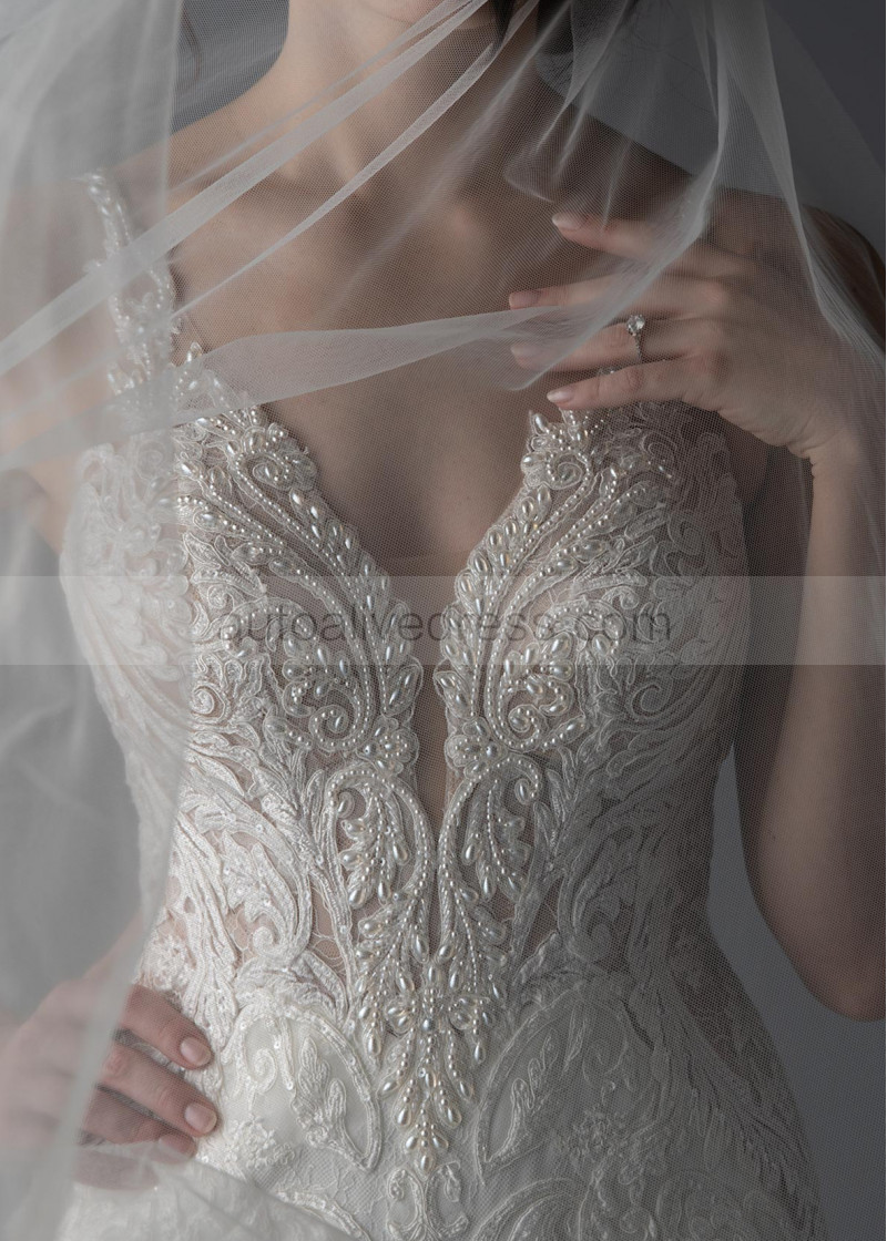 Beaded Ivory Lace Tulle Pearl Deep V Buttons Back Wedding Dress