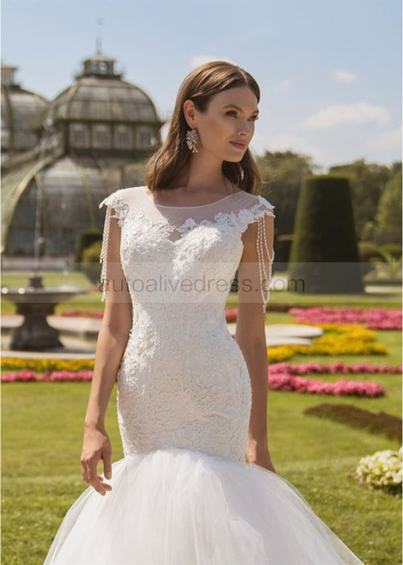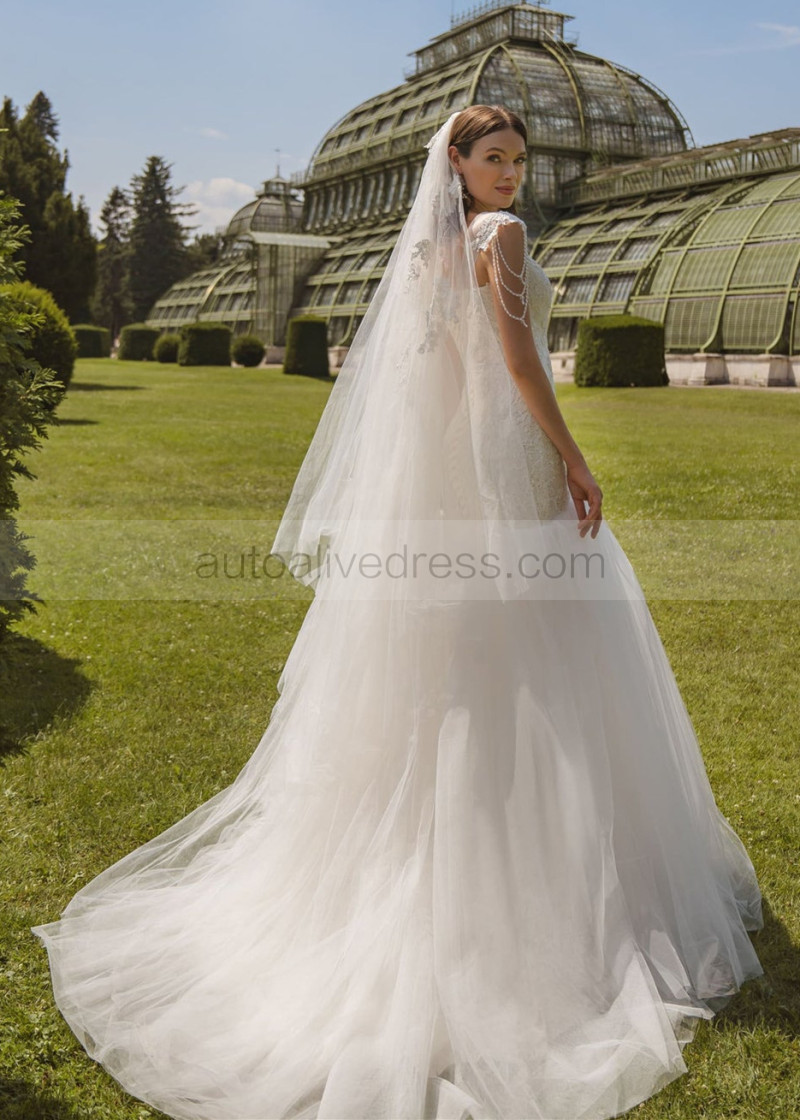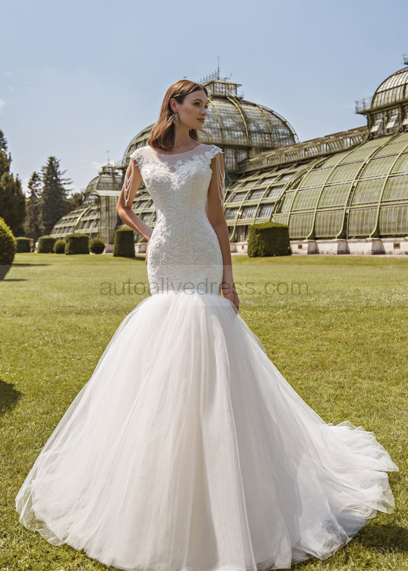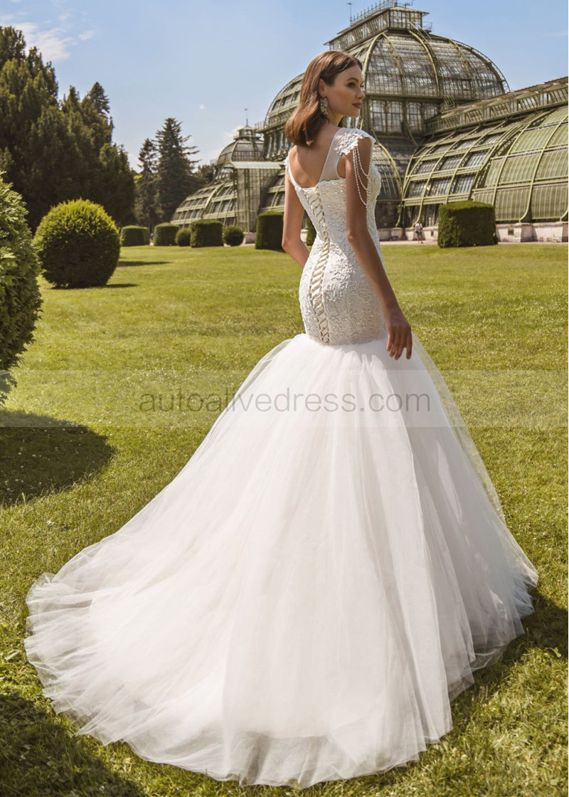 Beaded Lace Tulle Wedding Dress With Pearl Hanging