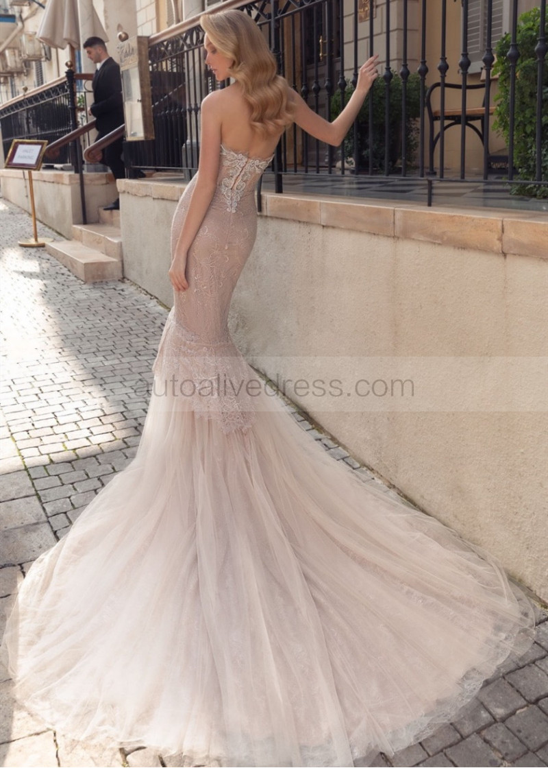 Beaded Light Beige Lace Tulle Wedding Dress With Detachable Sleeve