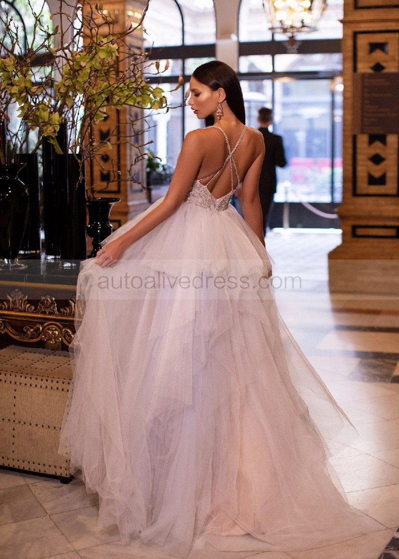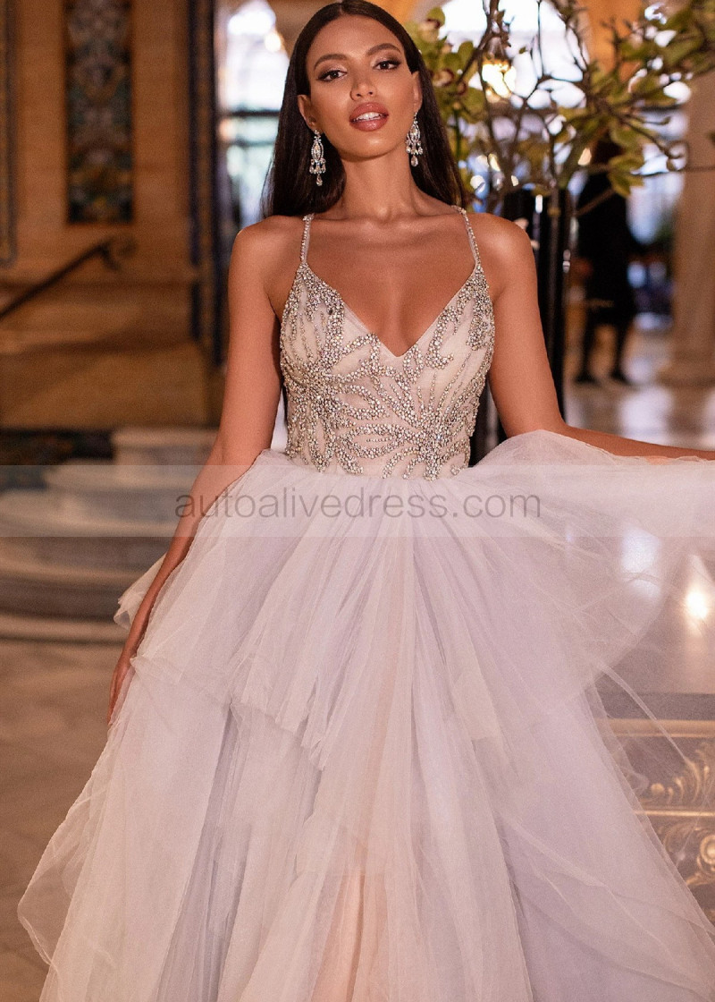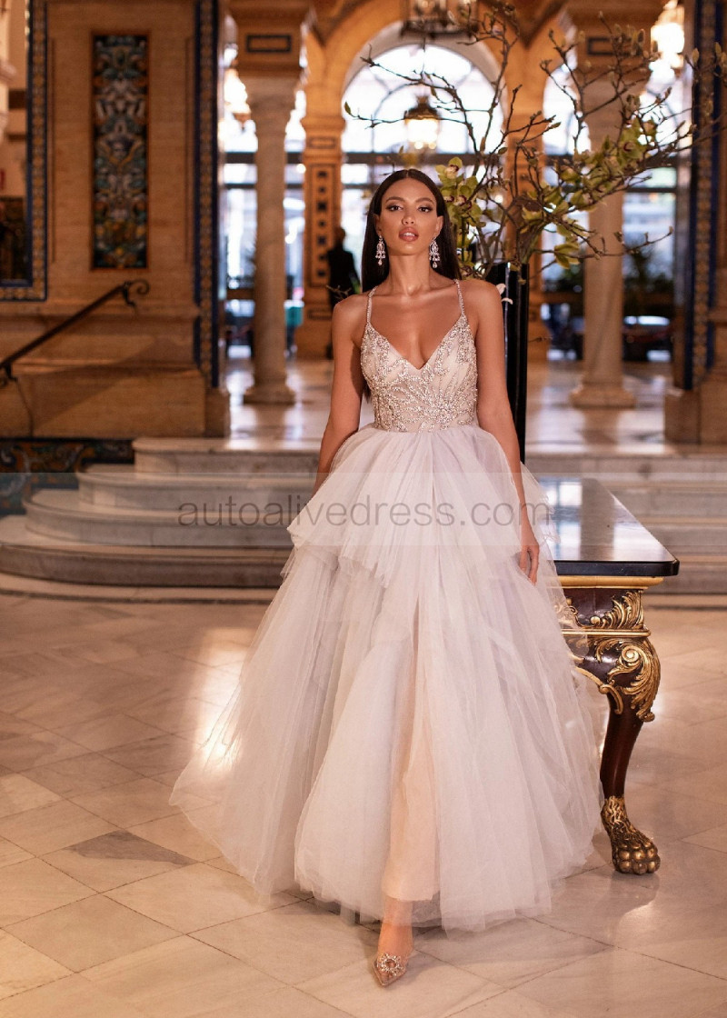 Beaded Multicoloured Tulle Tiered Evening Dress