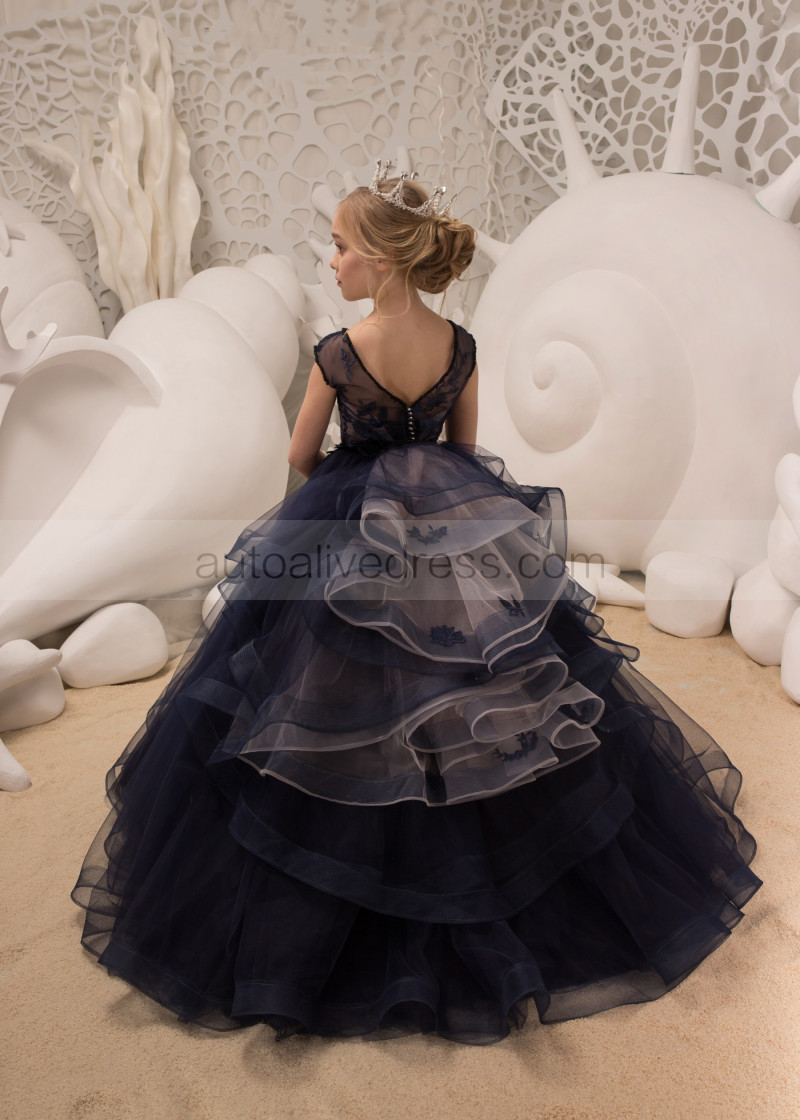 Beaded Navy Blue And Blush Lace Tulle V Back Flower Girl Dress