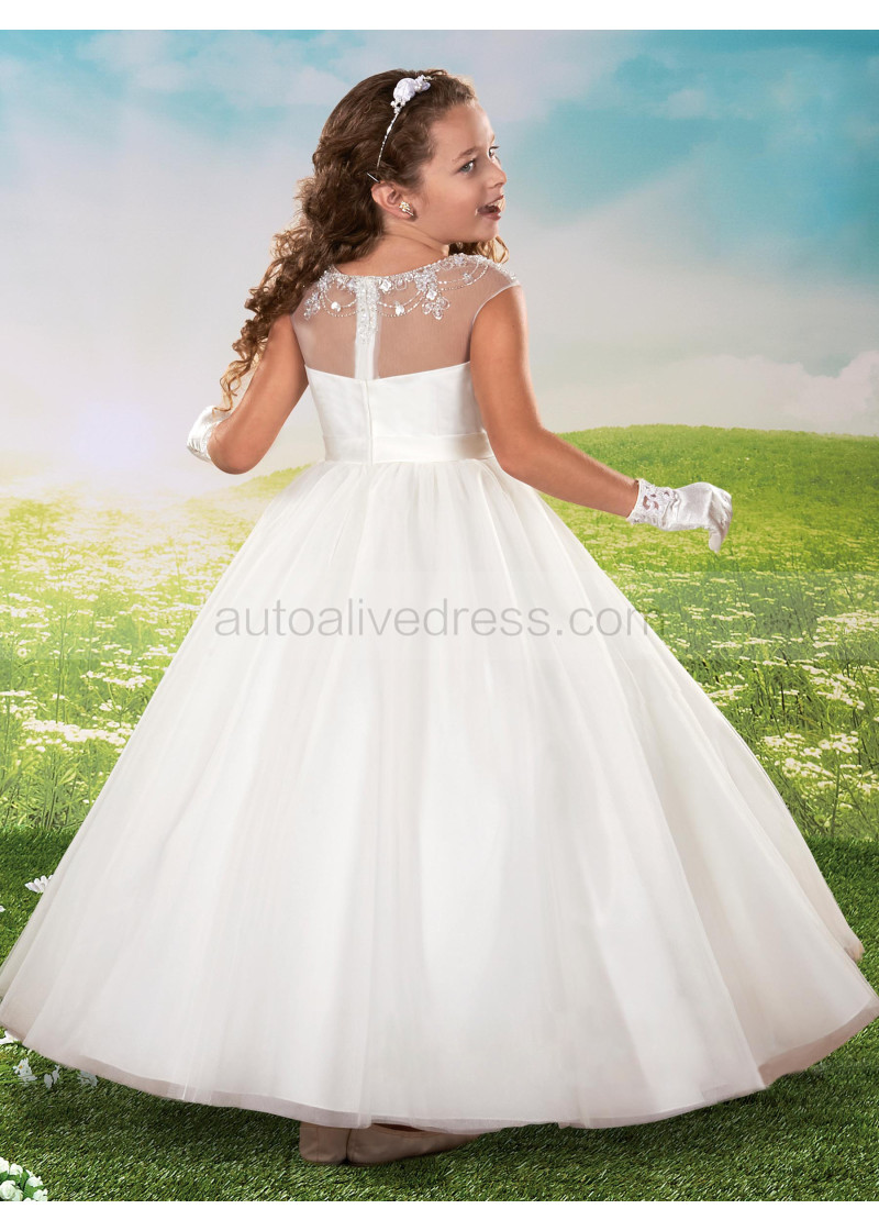 Beaded Sheer Neck Ivory Tulle Flower Girl Dress