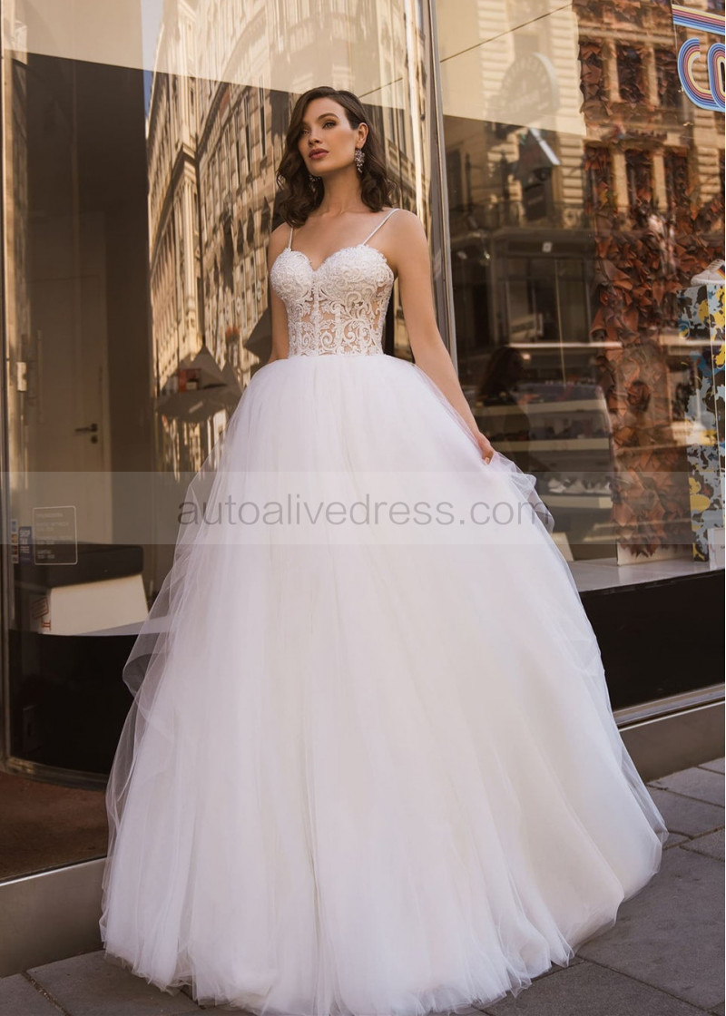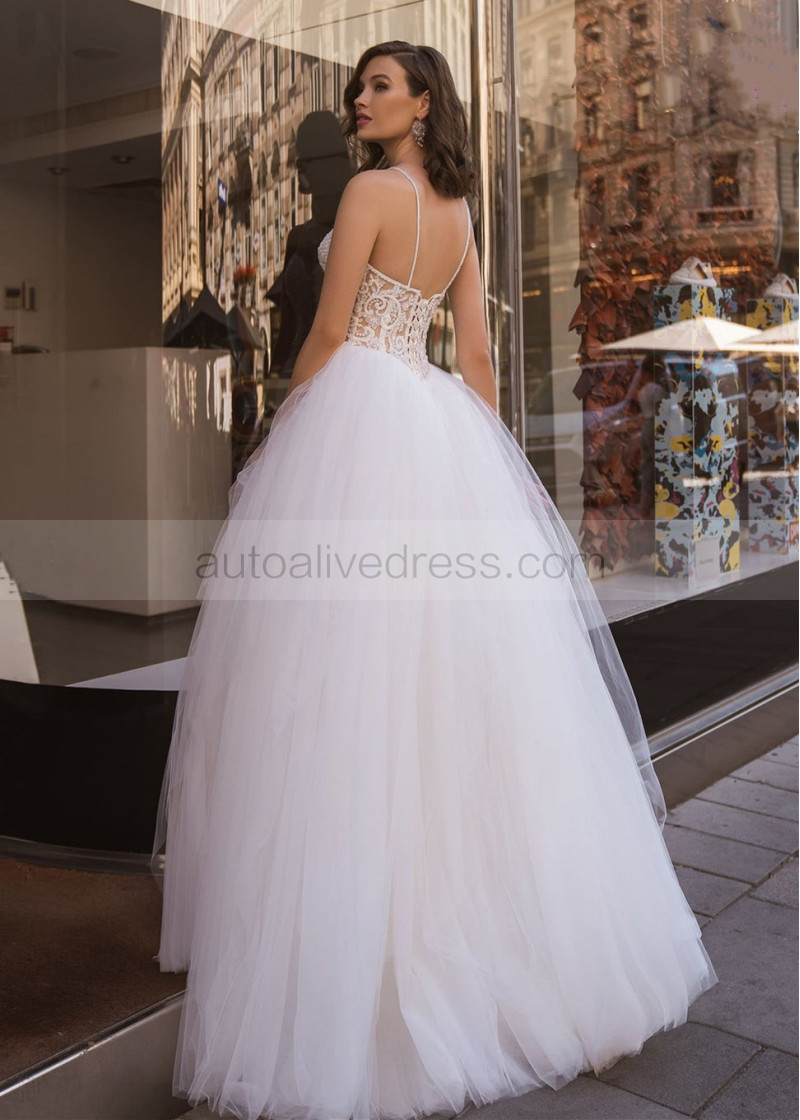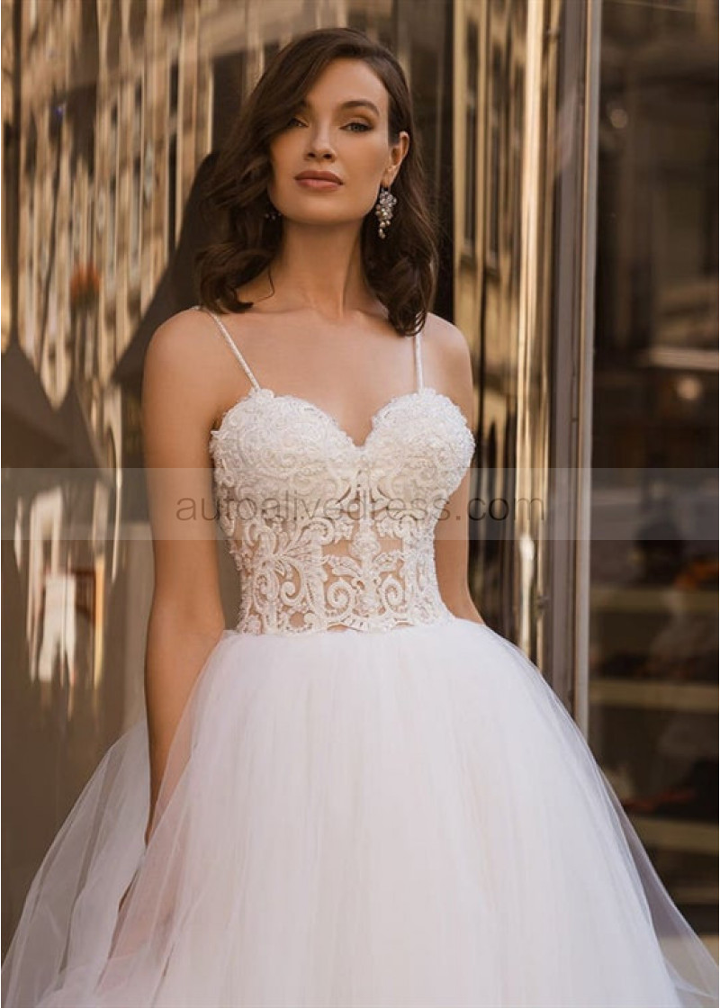 Beaded Spaghetti Straps Lace Tulle Wedding Dress