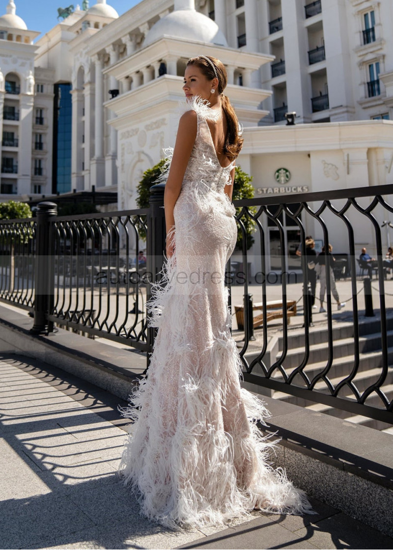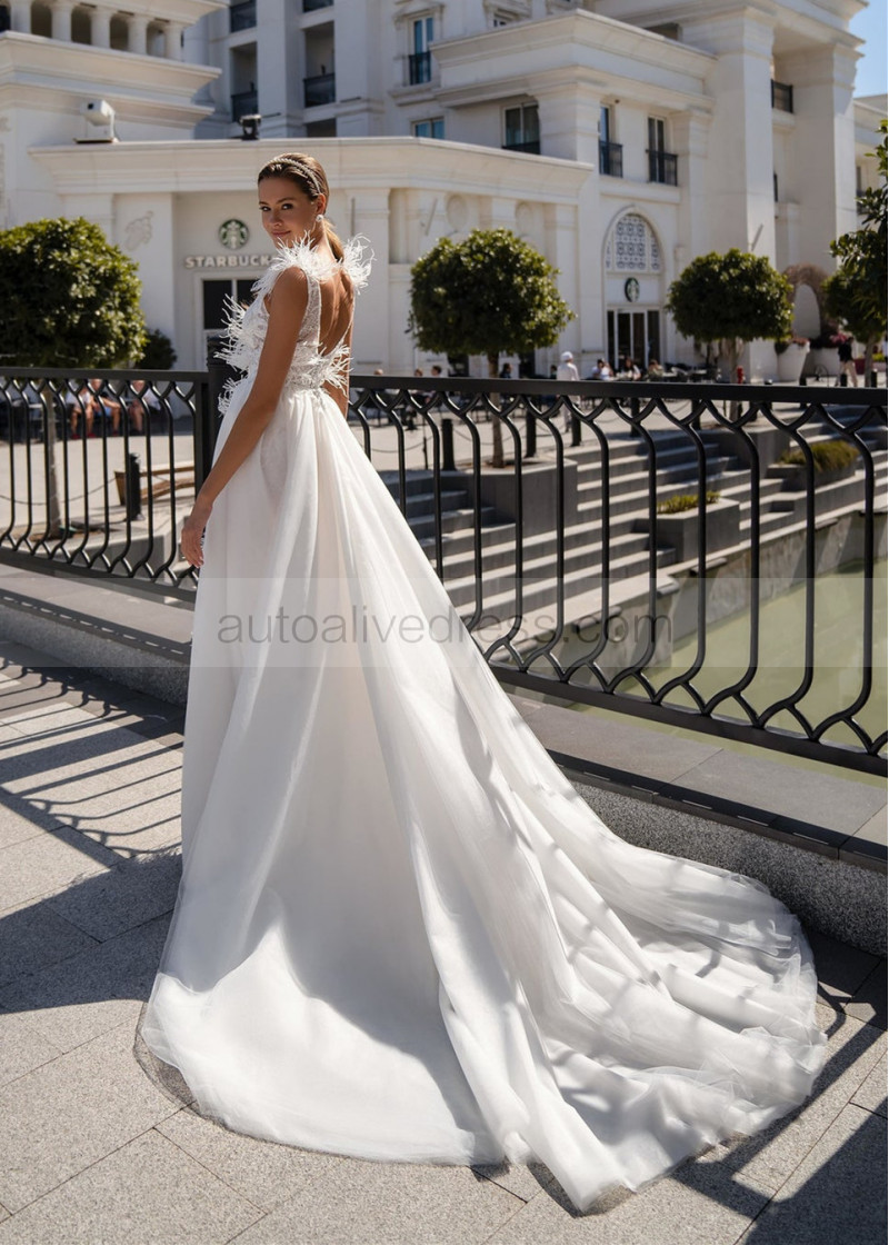 Beaded White Lace Feather Wedding Dress With Removable Train