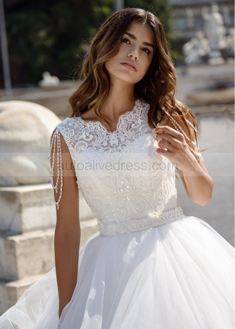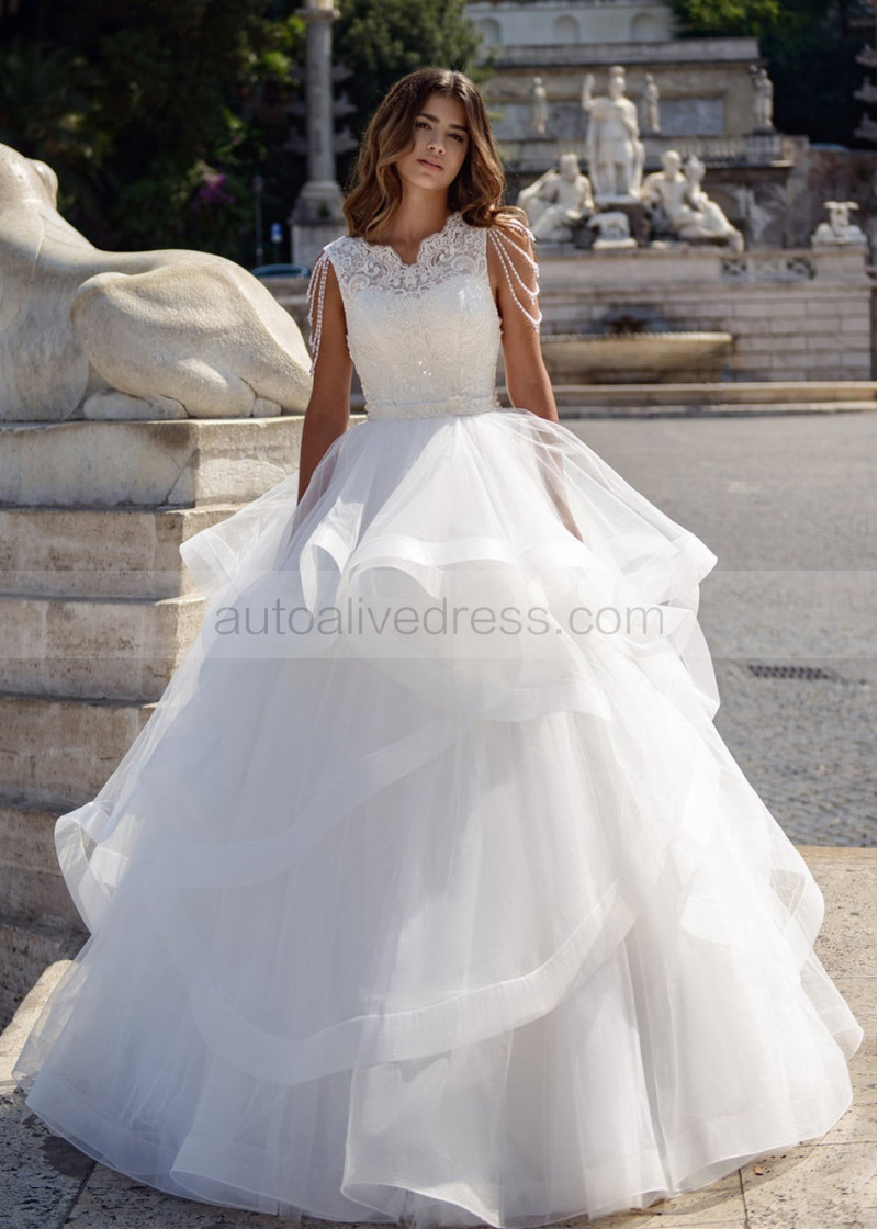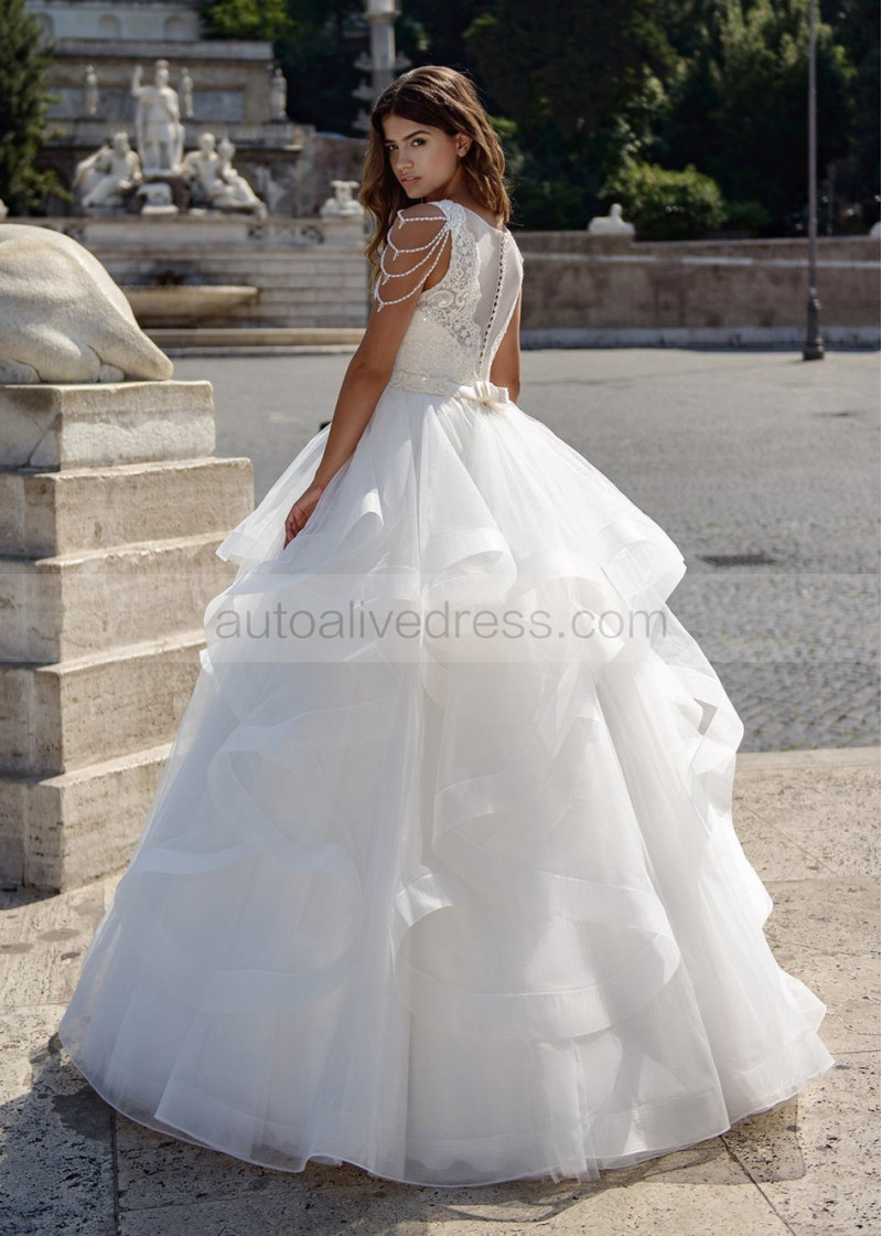 Beaded White Lace Tulle Ruffled Horsehair Hem Wedding Dress