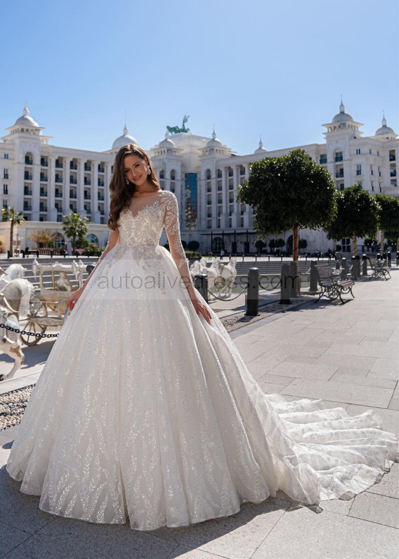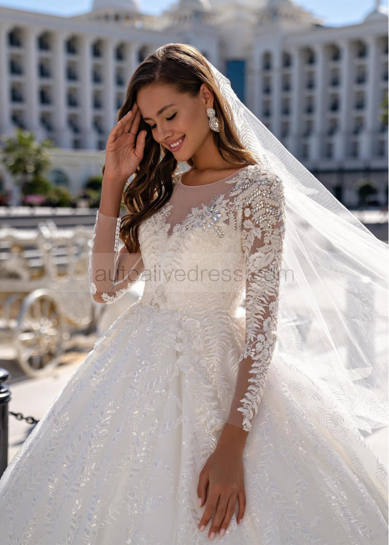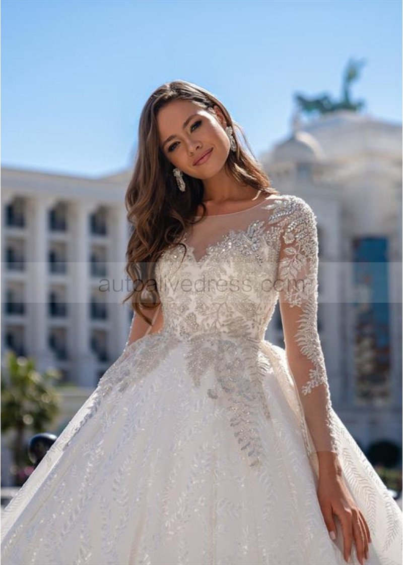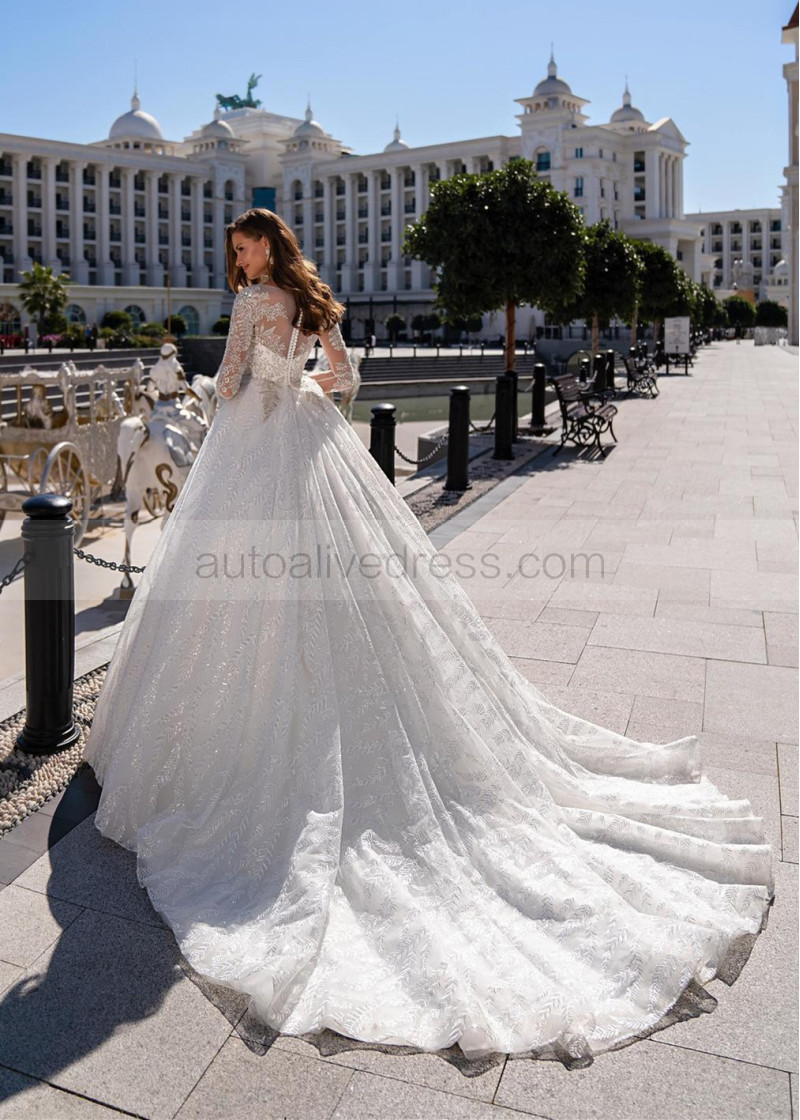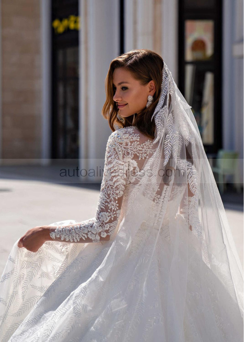Beaded White Lace Tulle Wedding Dress With Long Train