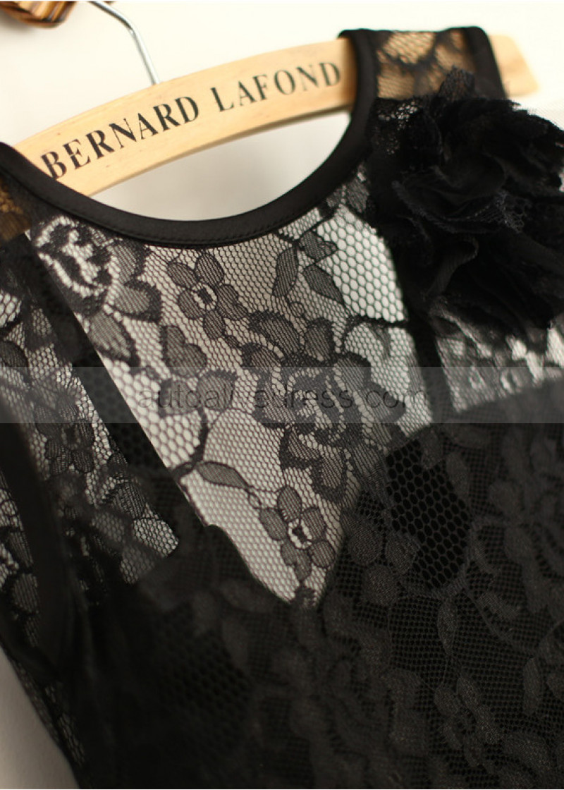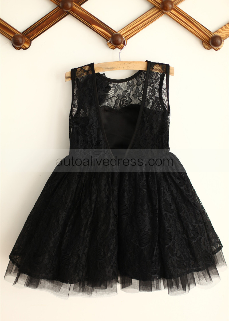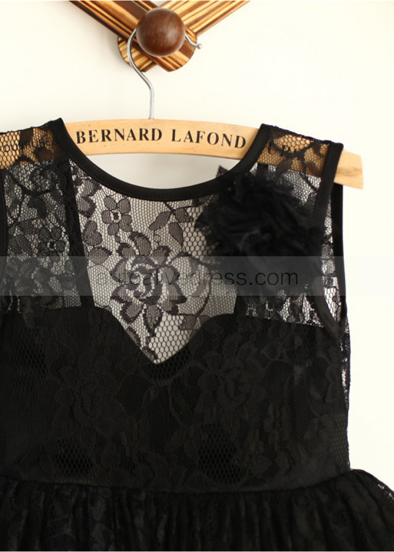 Black Lace Tulle V Back Knee Length Flower Girl Dress With Flower