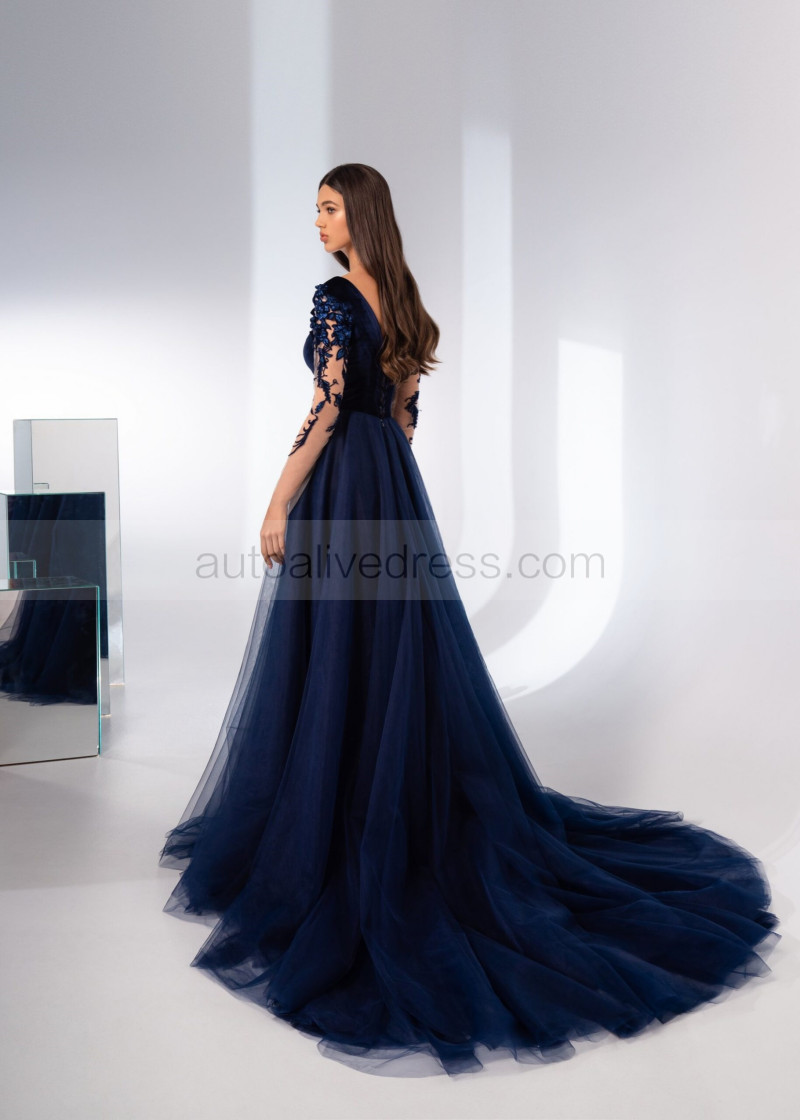 Boat Neck Navy Blue Velvet Tulle Unique Evening Dress