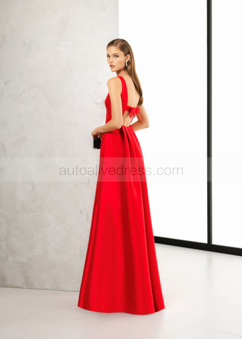Boat Neck Red Satin Open Back Evening Dress