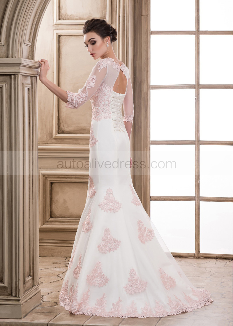 Elbow Sleeves Rose Pink Lace Tulle Wedding Dress
