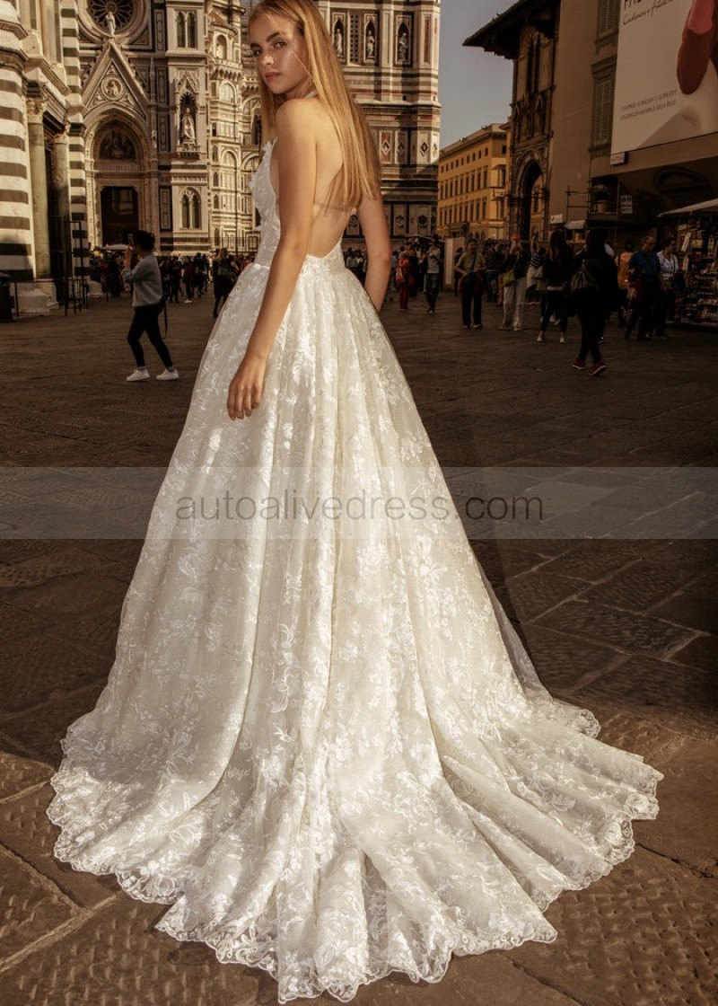 Halter Ivory Lace Low Back Wedding Dress