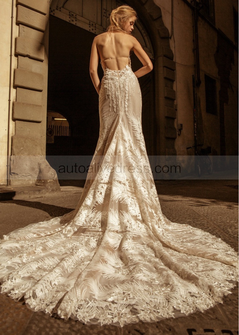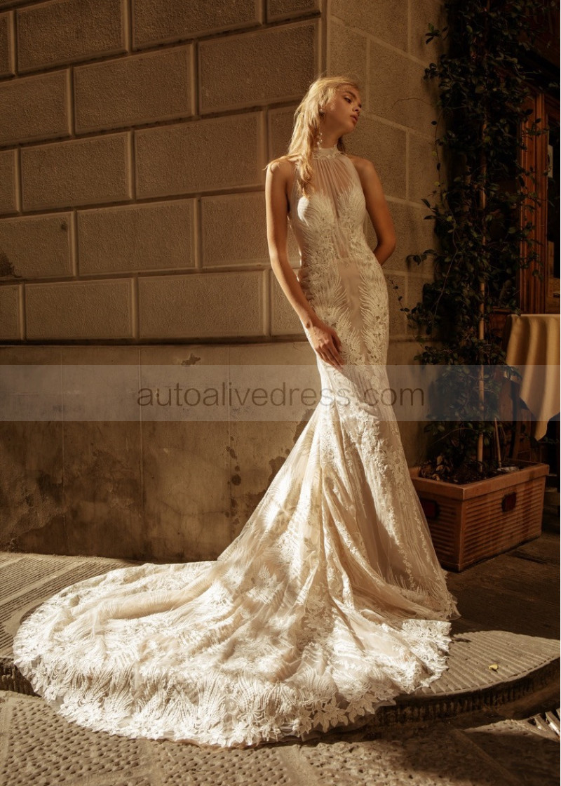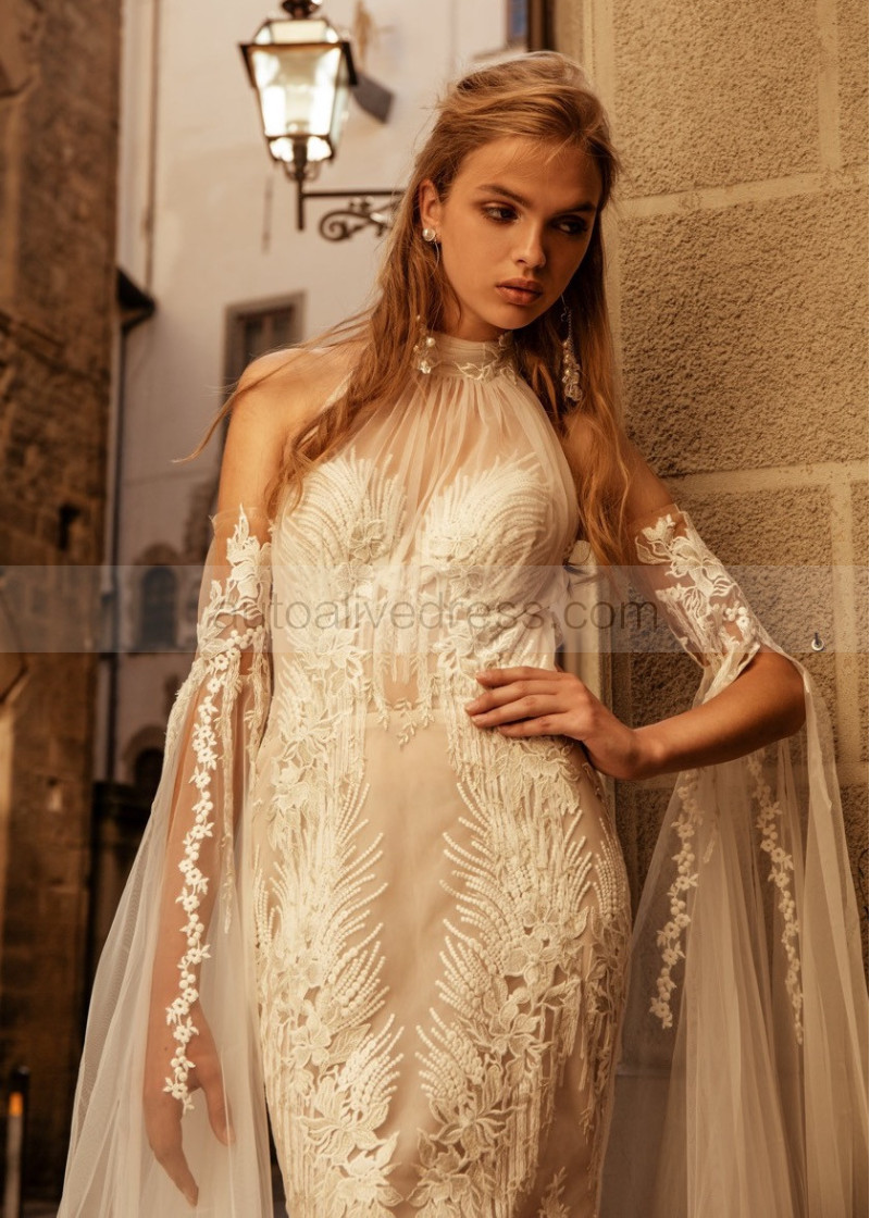 Halter Neck Ivory Lace Tulle Wedding Dress With Detachable Sleeve