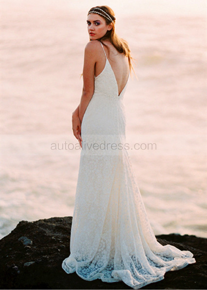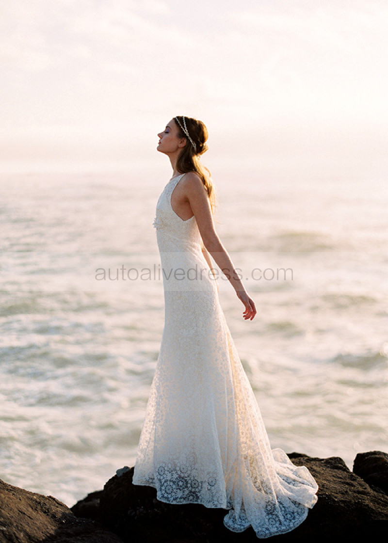 Ivory Lace Deep V Back Bohemian Wedding Dress