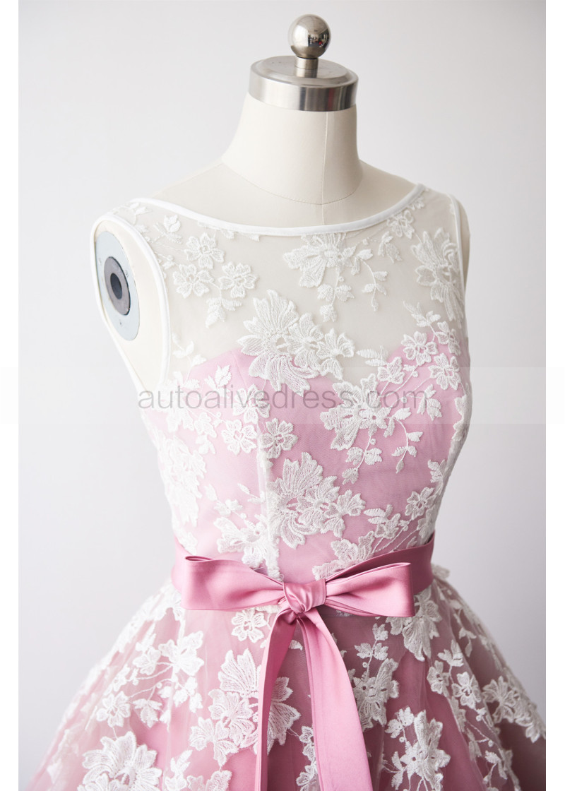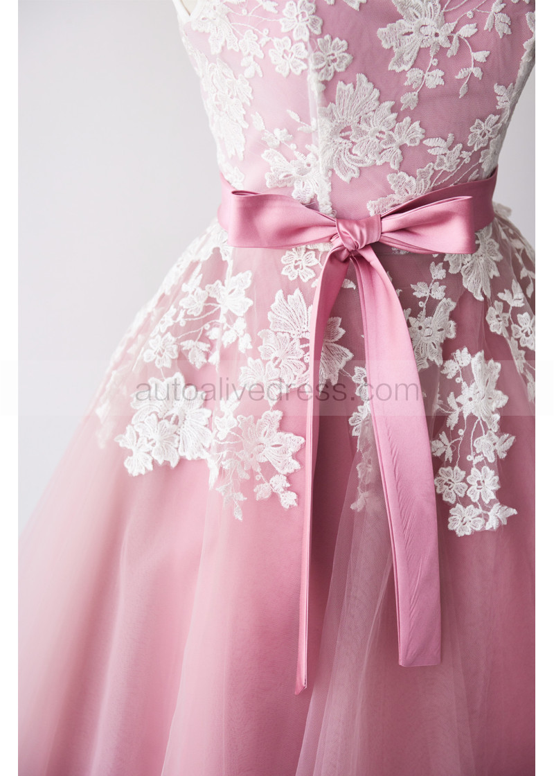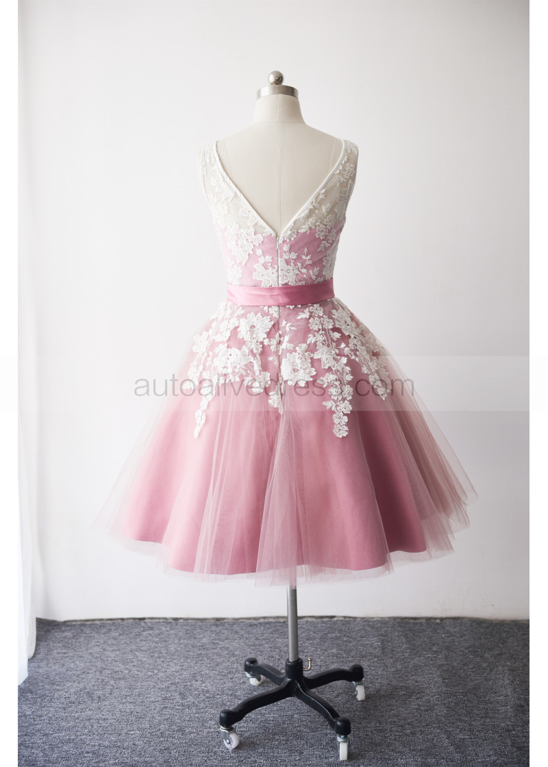 Ivory Lace Mauve Tulle V Back Knee Length Classic Bridesmaid Dress
