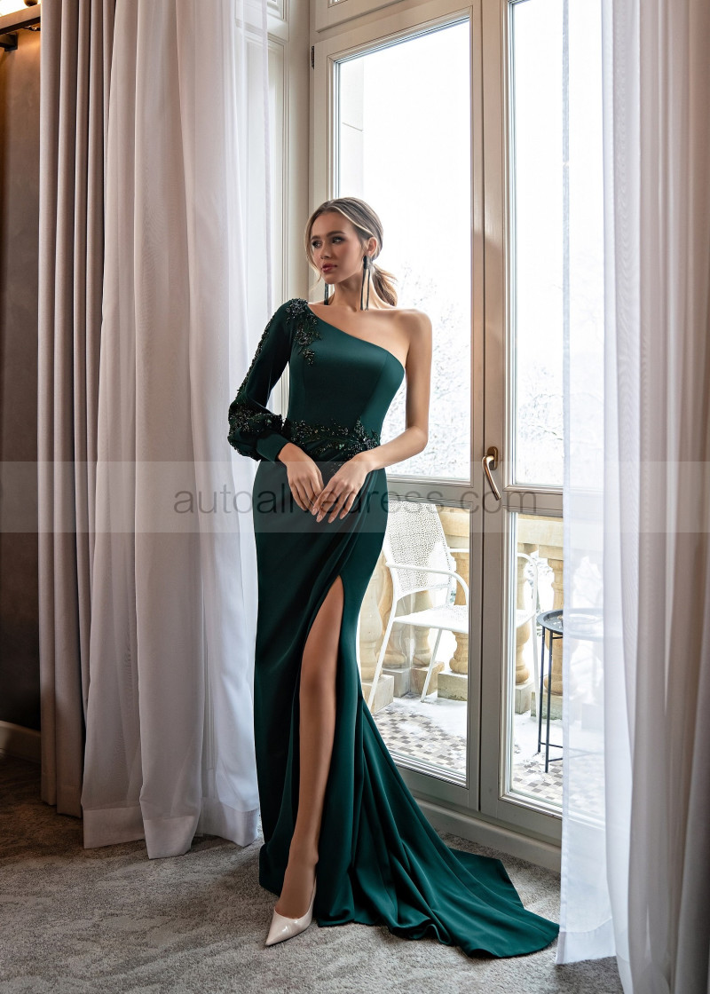 One Sleeve Beaded Satin Slit Sexy Evening Dress