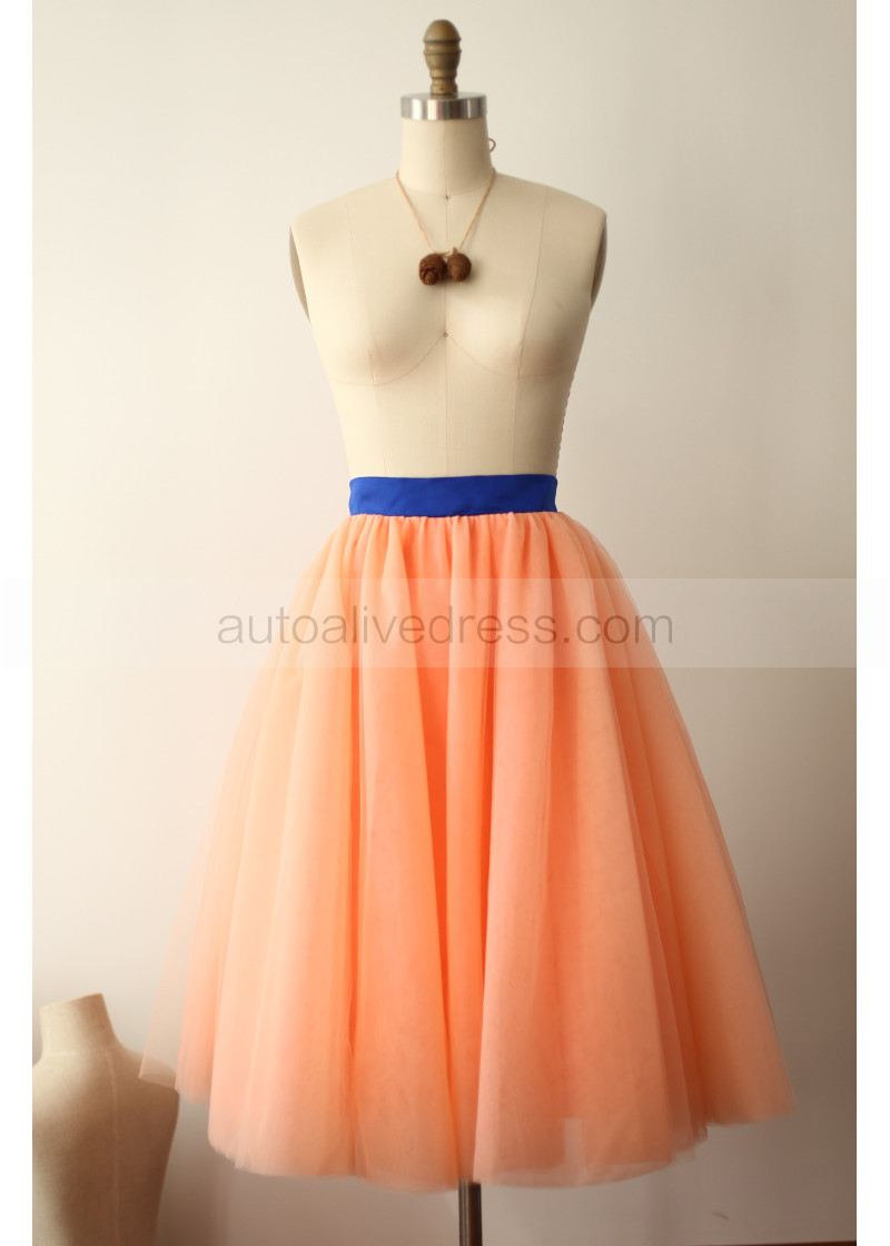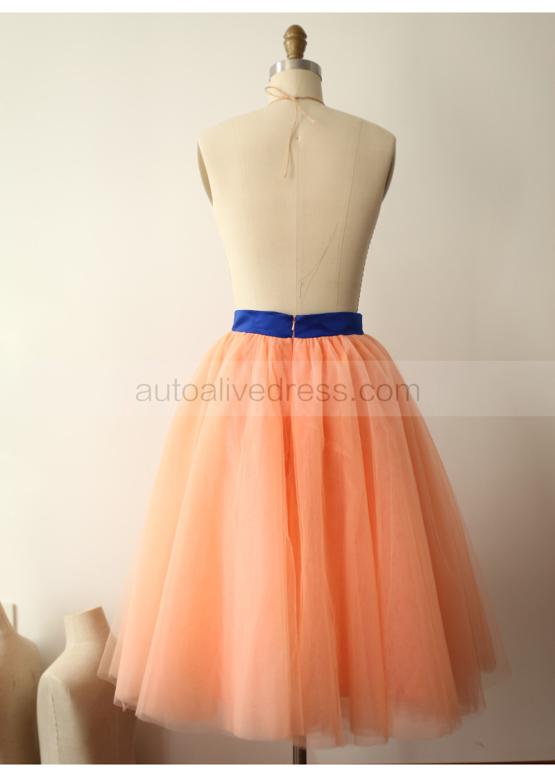 Peach Pink Tulle Royal Blue Satin Belt Short Skirt