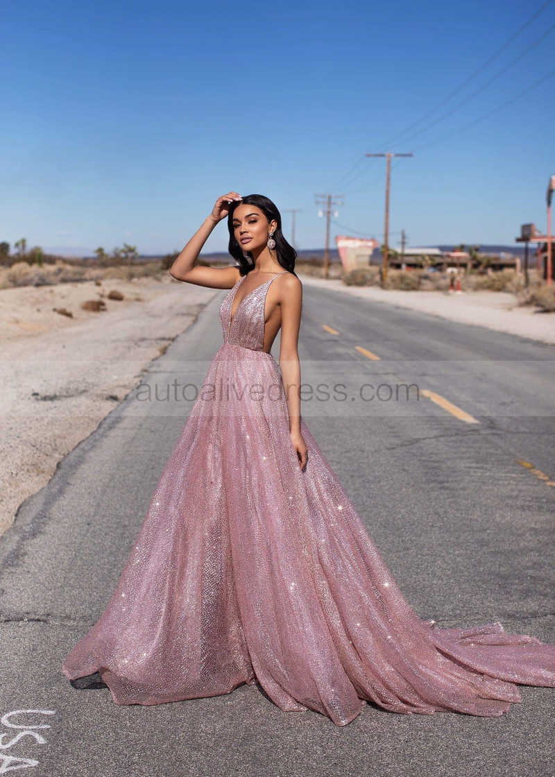 Rose Gold Glittering Backless Long Prom Dress