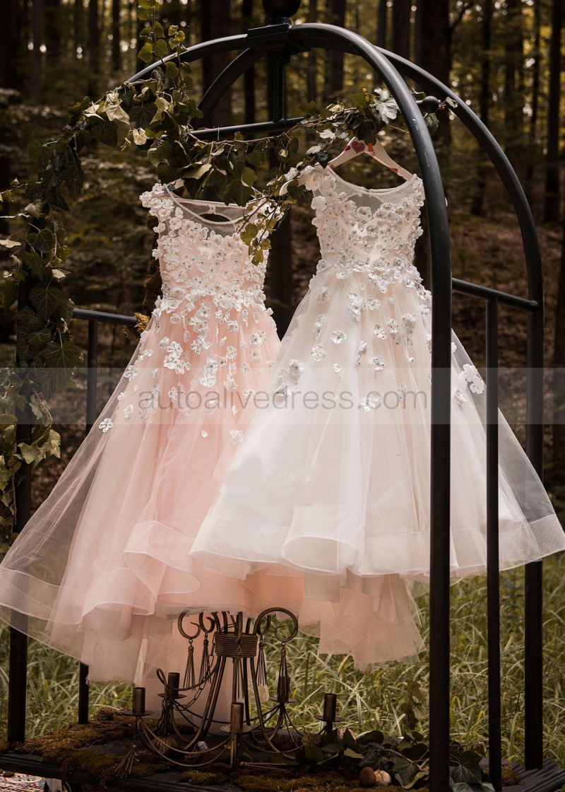 Beaded Blue Tulle 3D Flowers Keyhole Back Flower Girl Dress