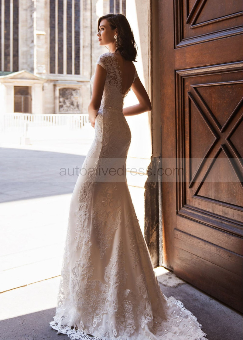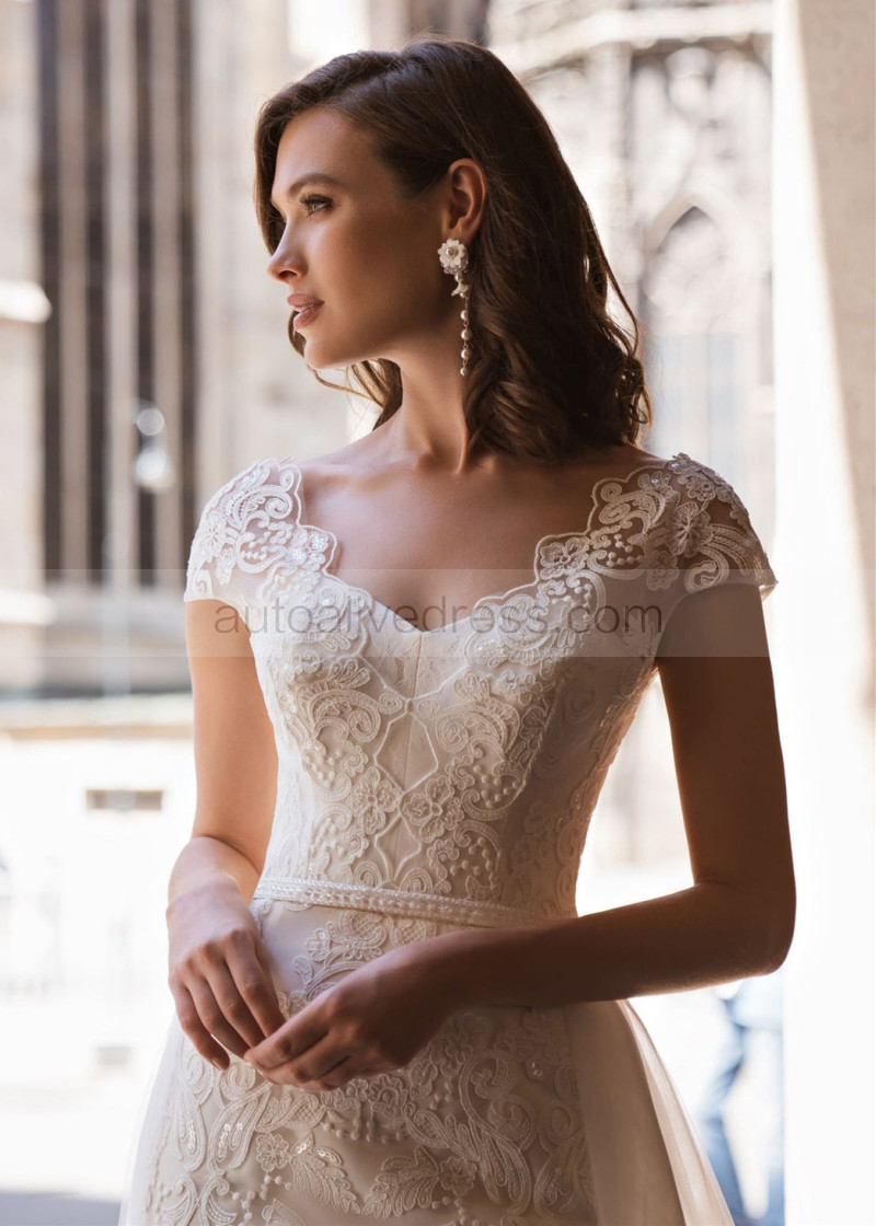 Beaded Cap Sleeves Lace Wedding Dress With Detachable Train