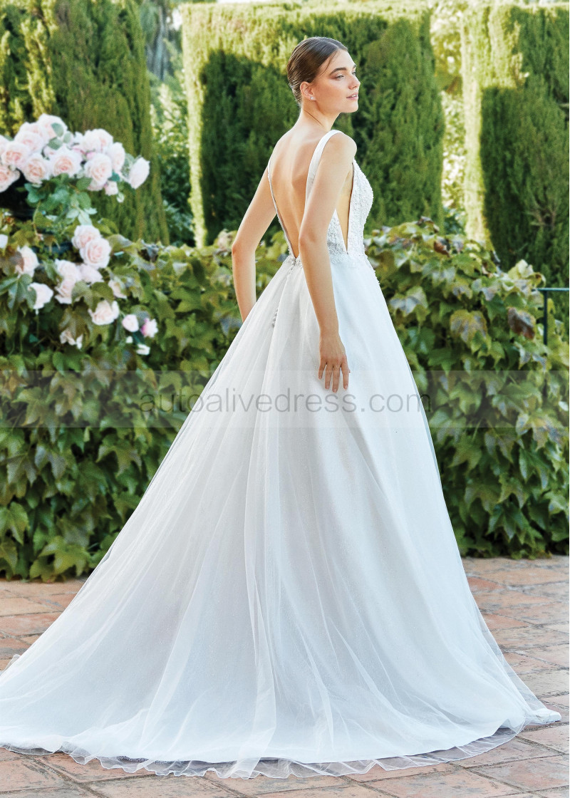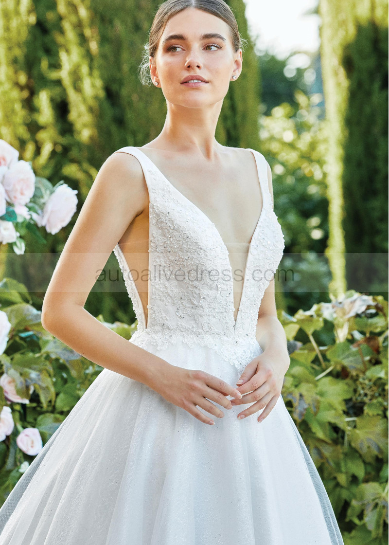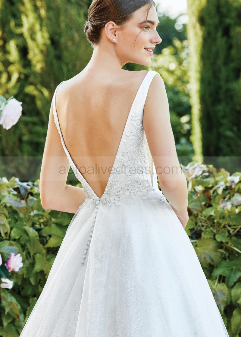 Beaded Ivory Lace Sparkle Tulle Deep V Back Wedding Dress