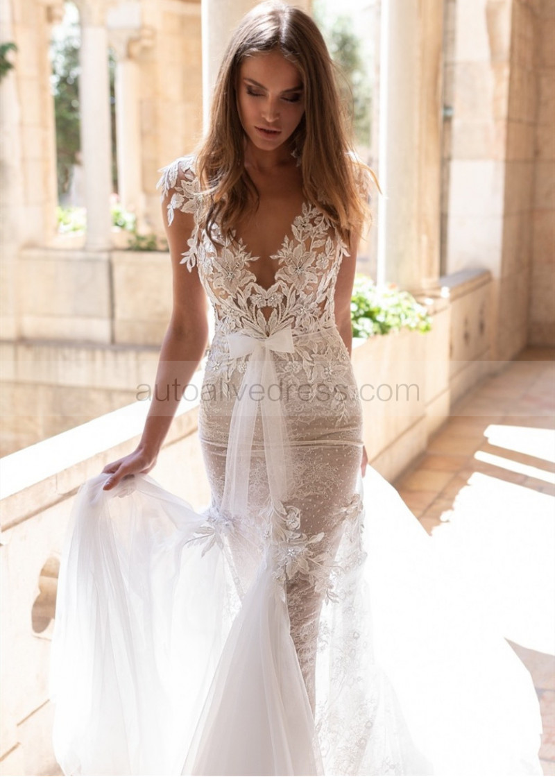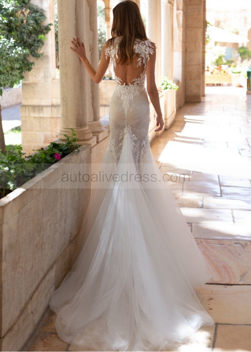 Beaded Ivory Lace Tulle Keyhole Back Wedding Dress