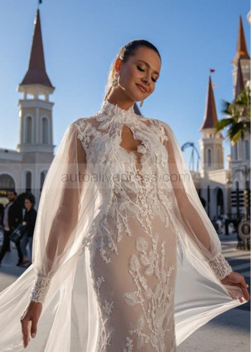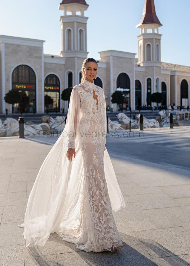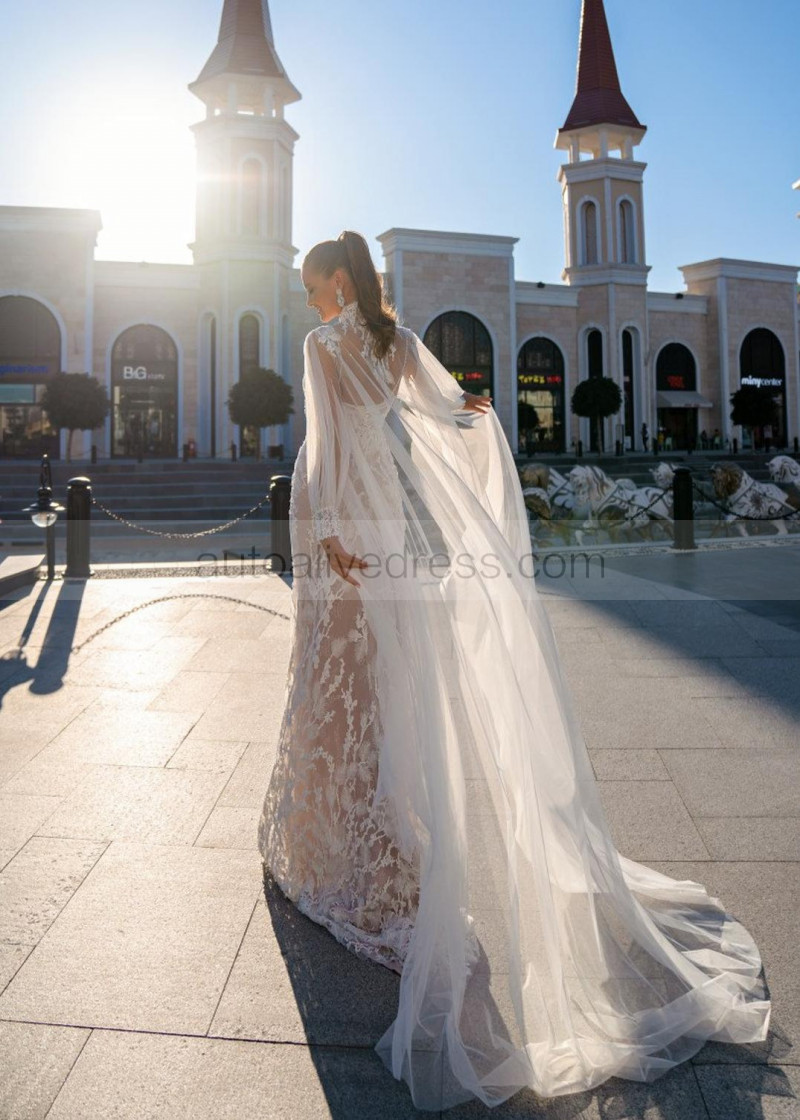 Beaded Ivory Lace Tulle Wedding Dress With Cape