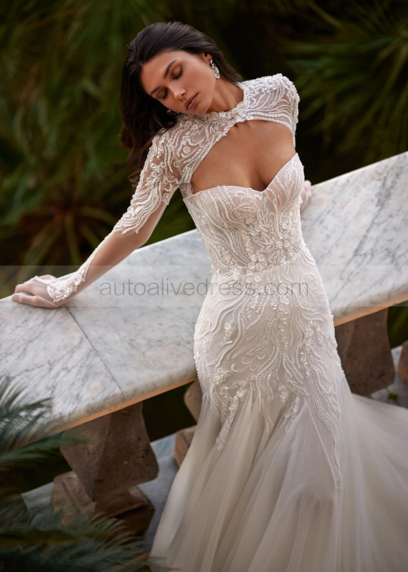 Beaded Ivory Lace Tulle Wedding Dress With Detachable Jacket