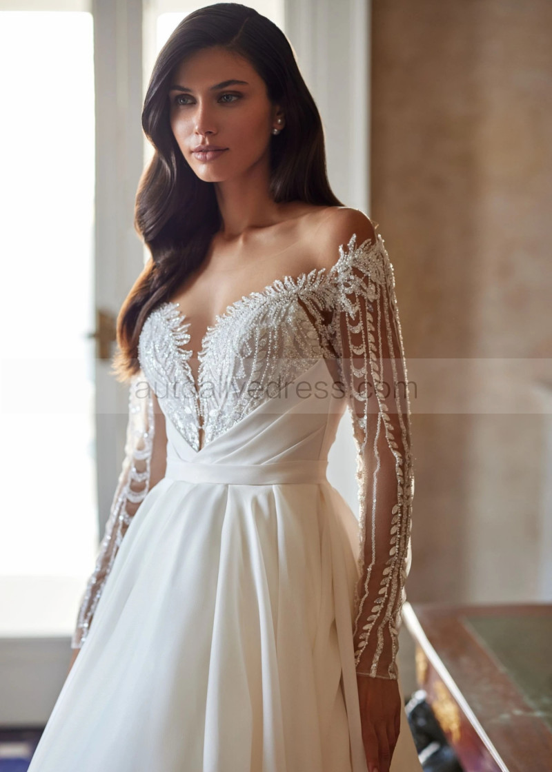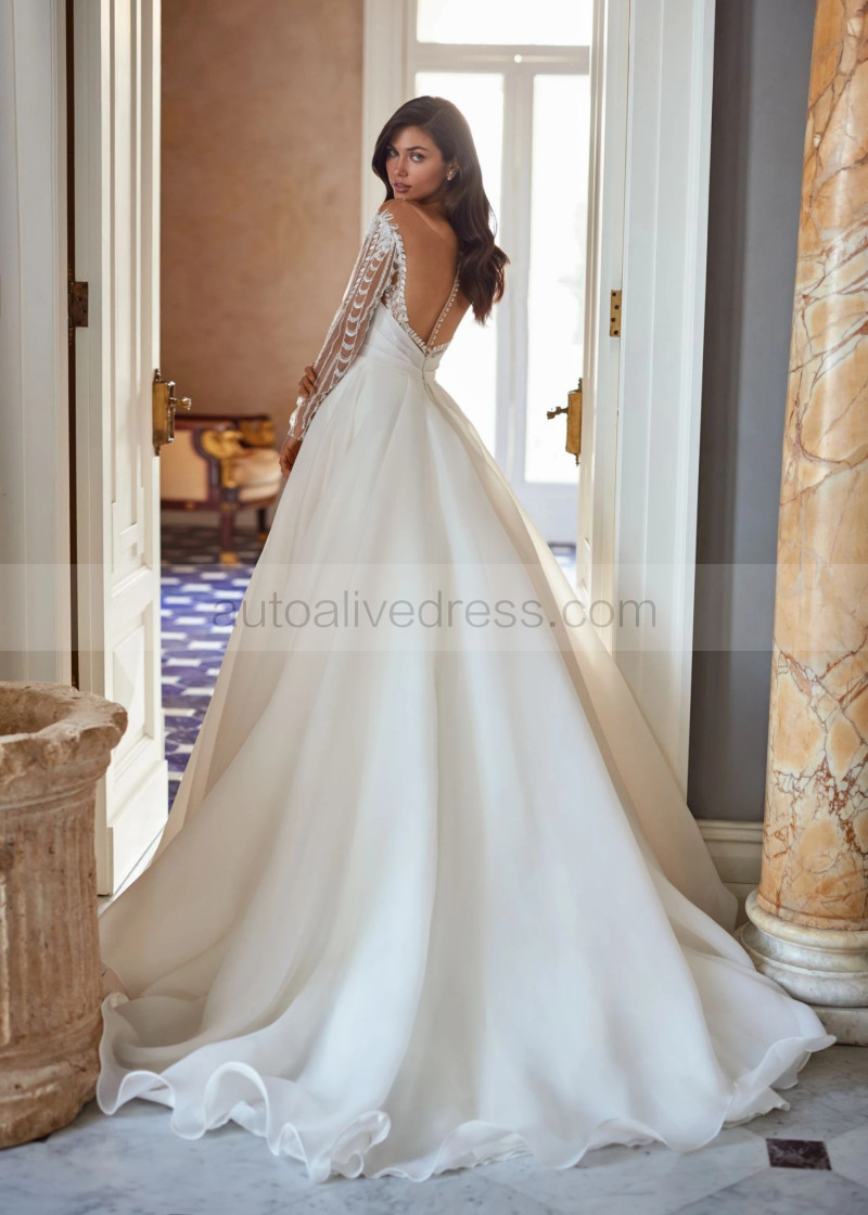 Beaded Long Sleeves Ivory Lace Organza Pretty Wedding Dress
