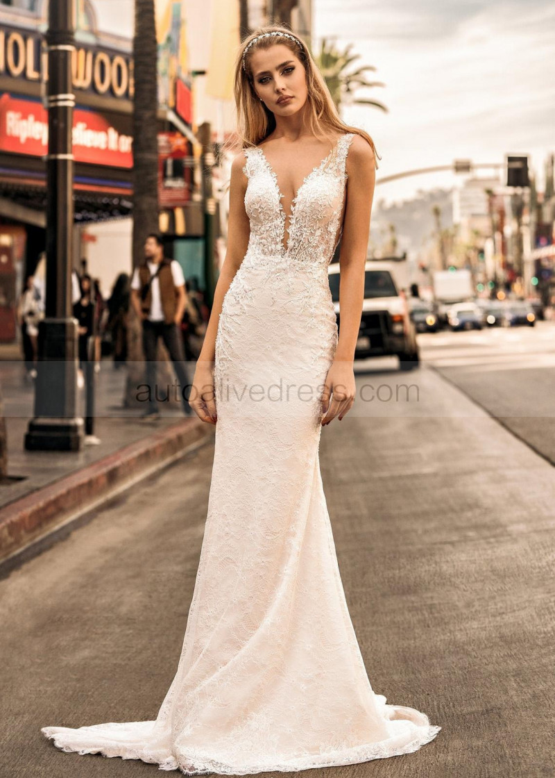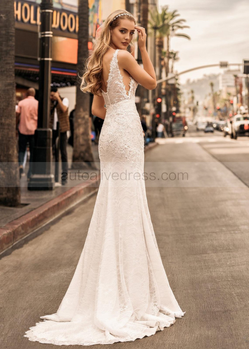Beaded V Neck Ivory Lace Long Wedding Dress