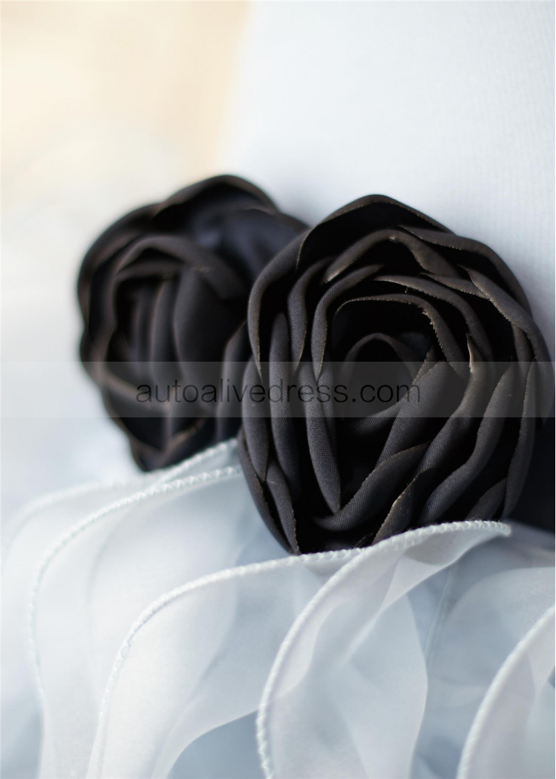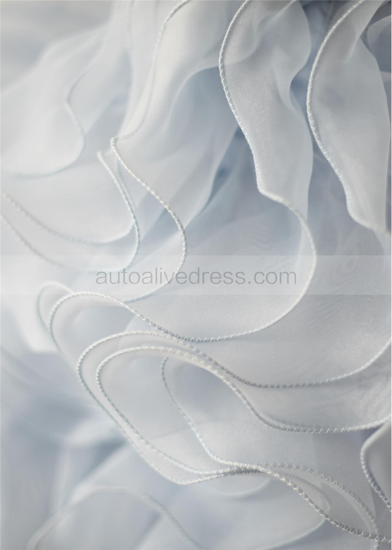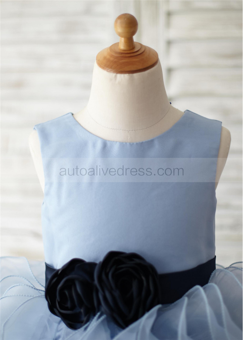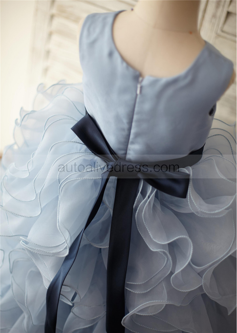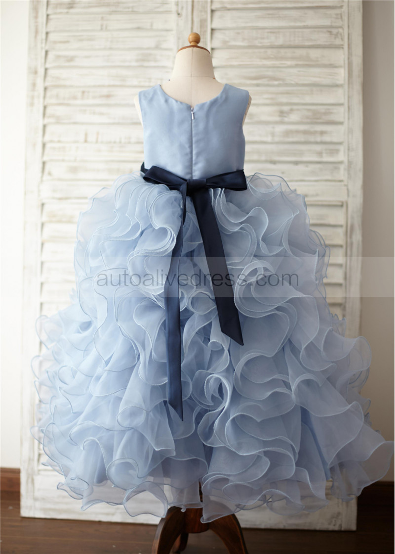 Blue Satin Organza Ruffled Flower Girl Dress With Flower Sash