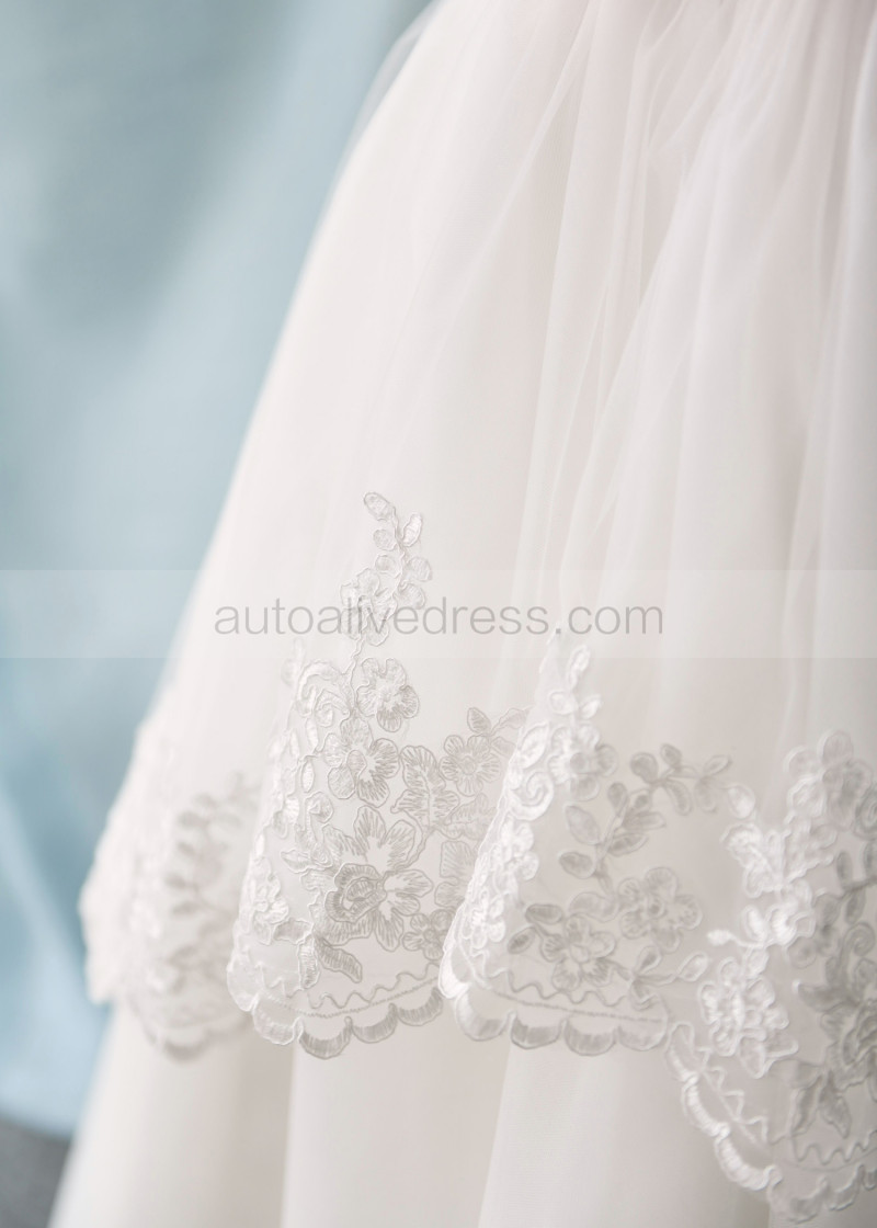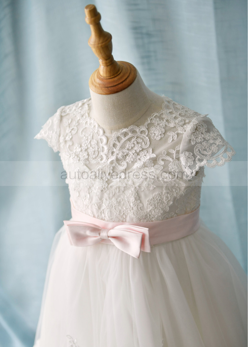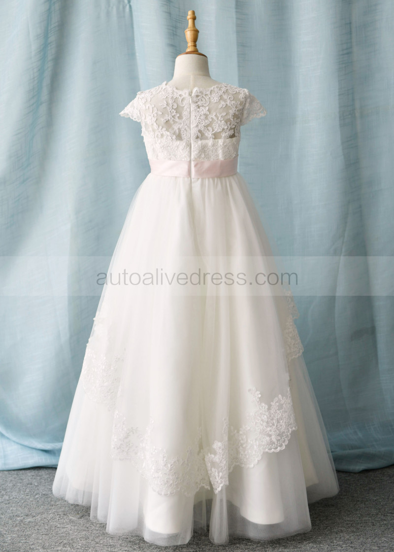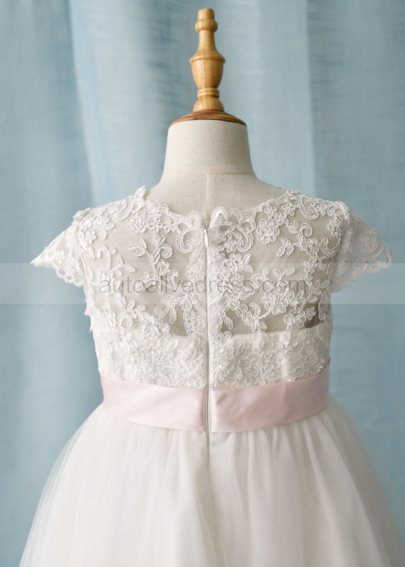 Cap Sleeves Ivory Lace Tulle Floor Length Flower Girl Dress