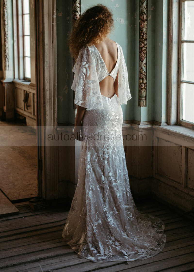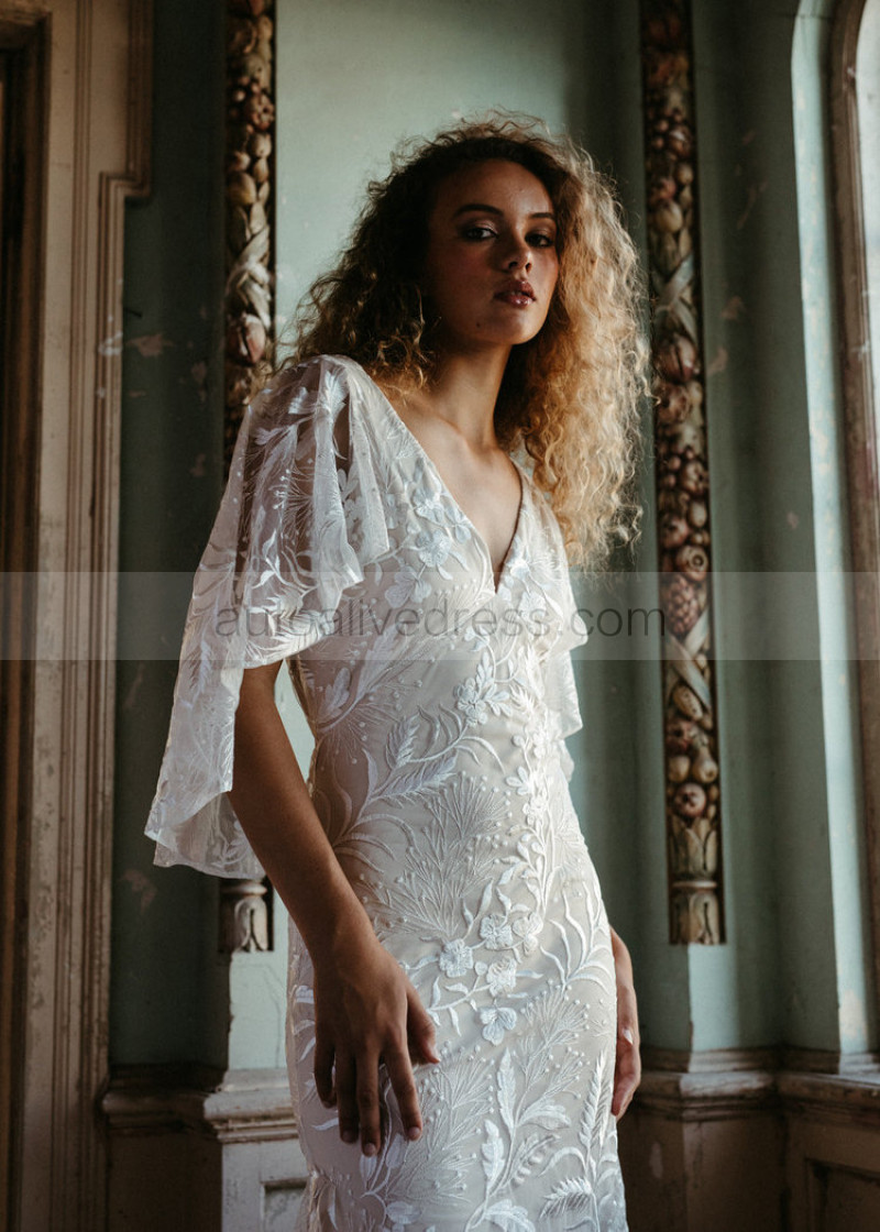 Cape Sleeves Ivory Embroidered Lace Wedding Dress With Nude Lining