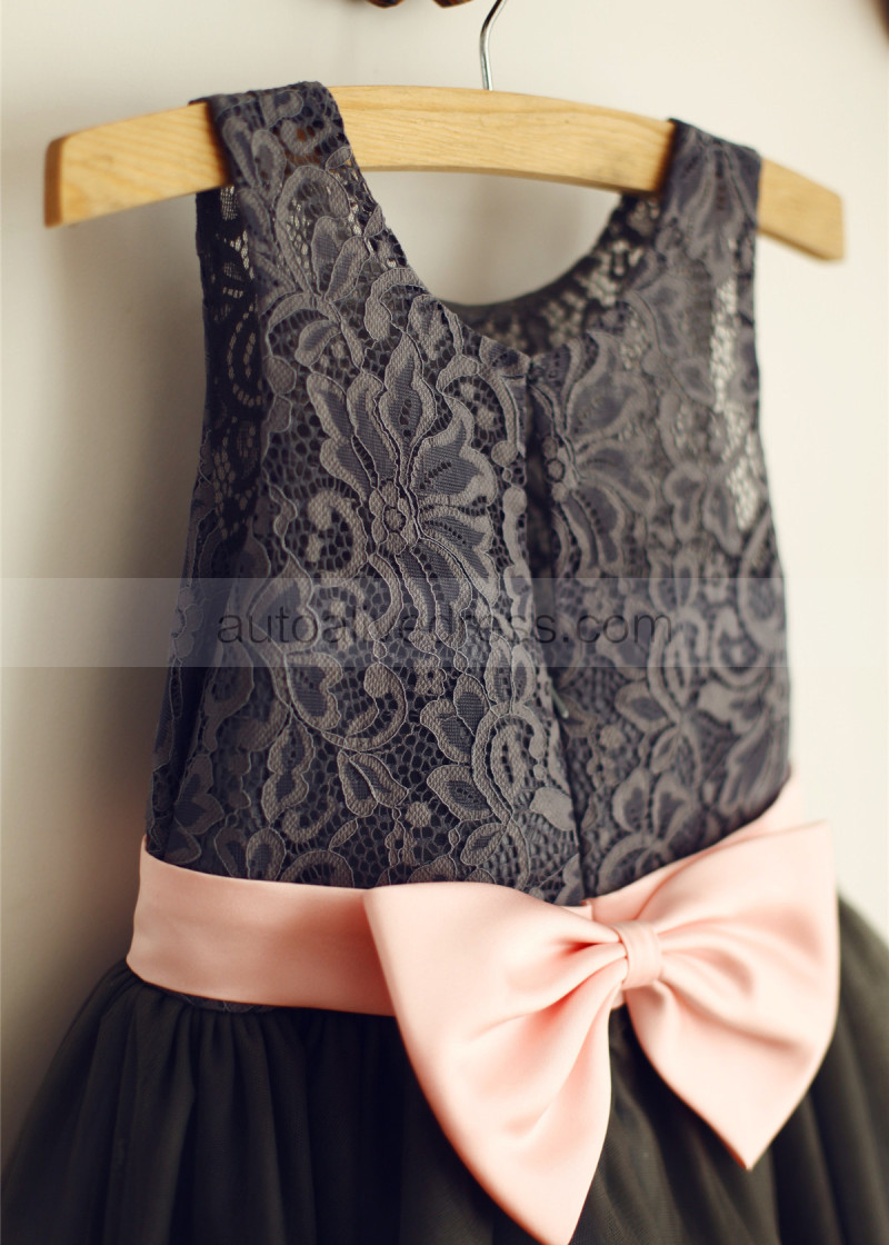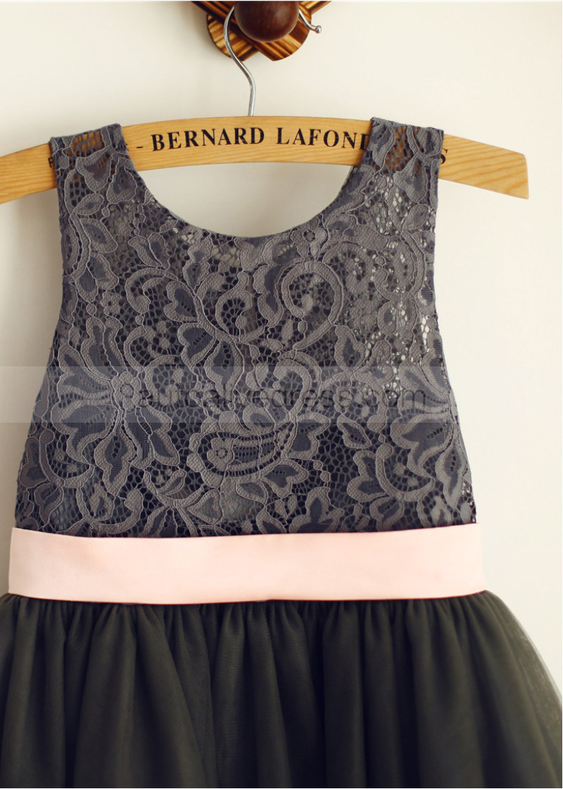 Dark Gray Lace Tulle Slit Open Back Flower Girl Dress
