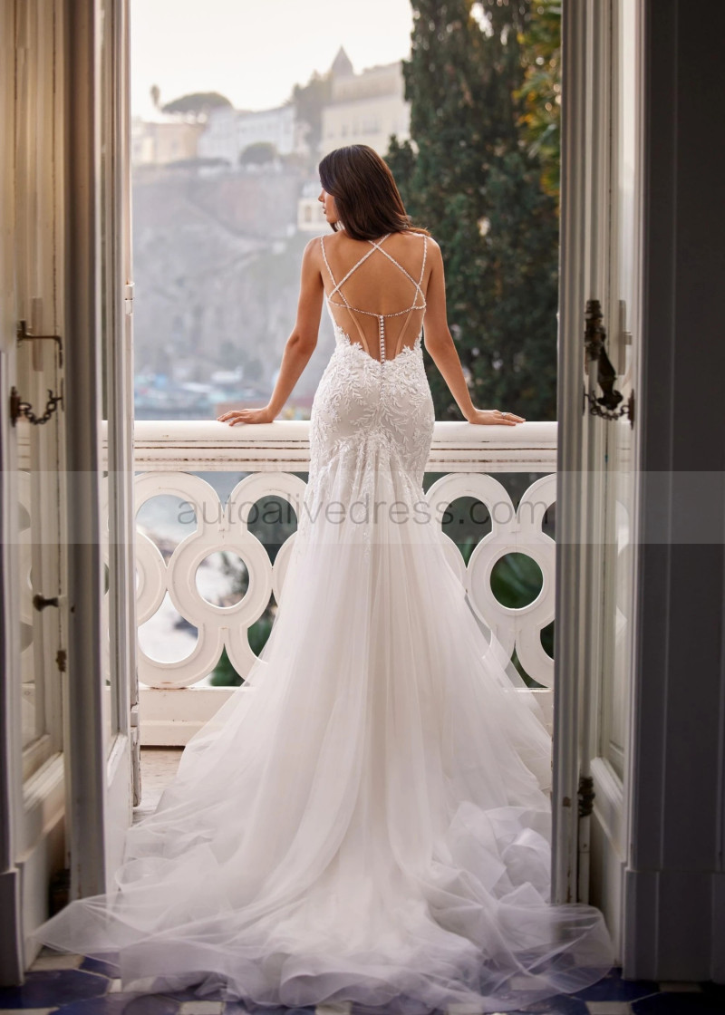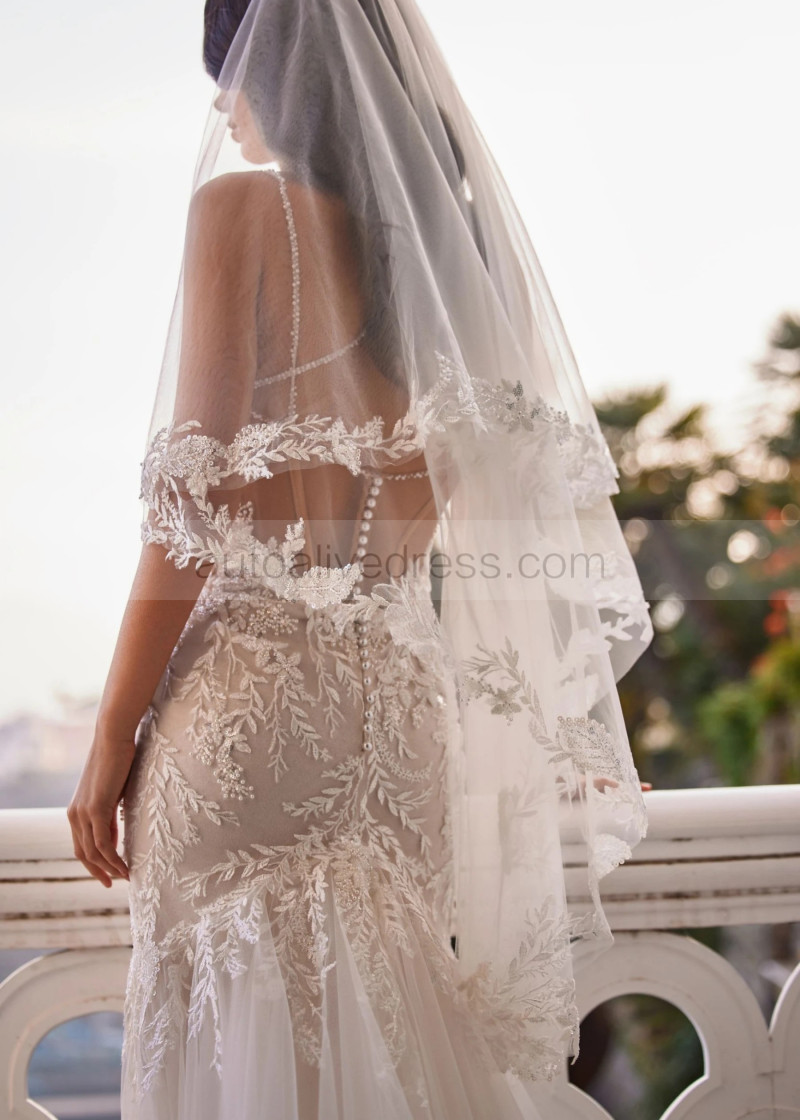 Double Straps Beaded Ivory Lace Tulle Shimmering Wedding Dress