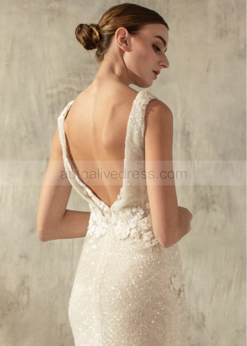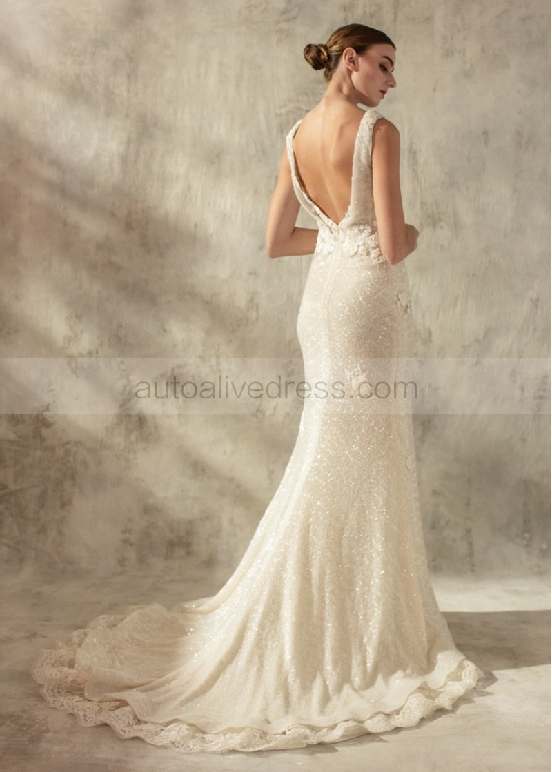 Draped Neck Ivory Sparkly Sequin Lace Trim Wedding Dress