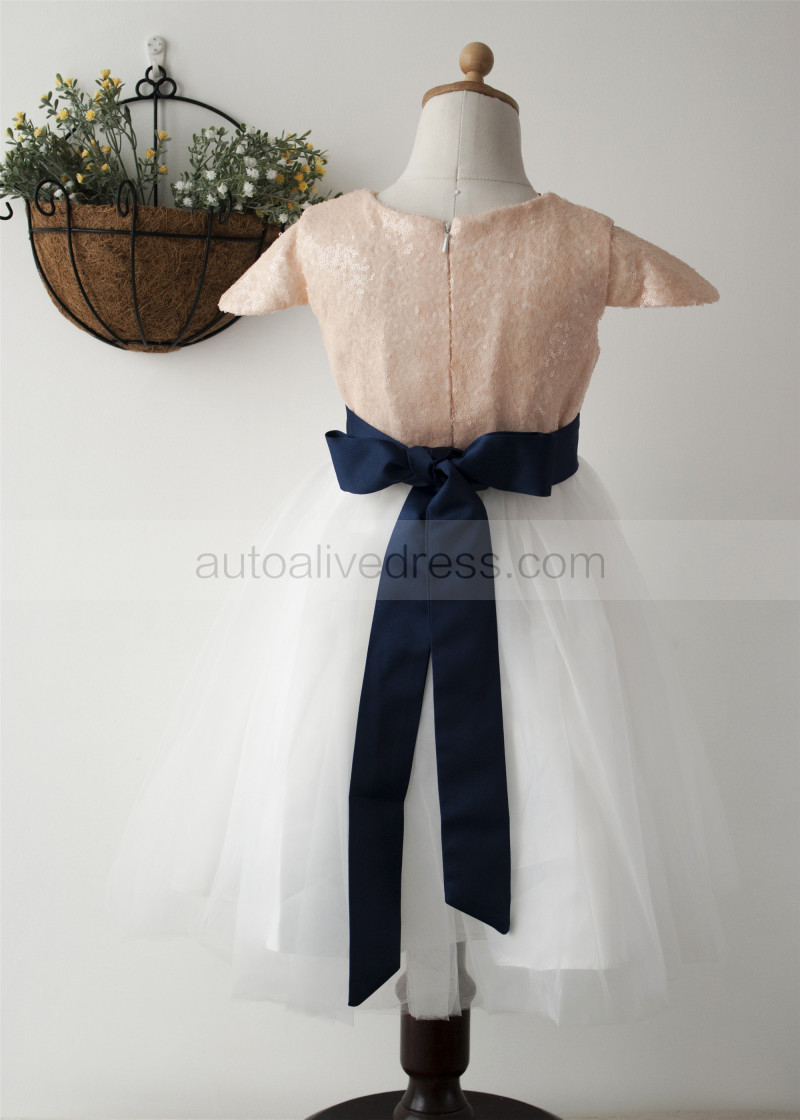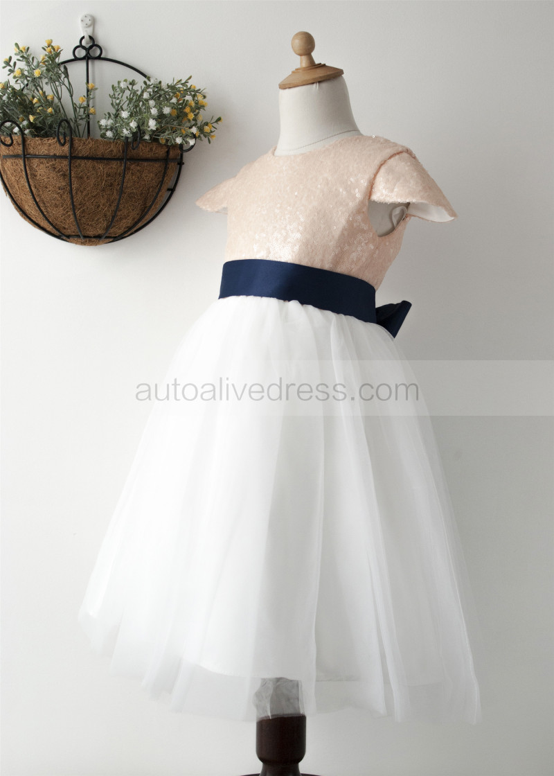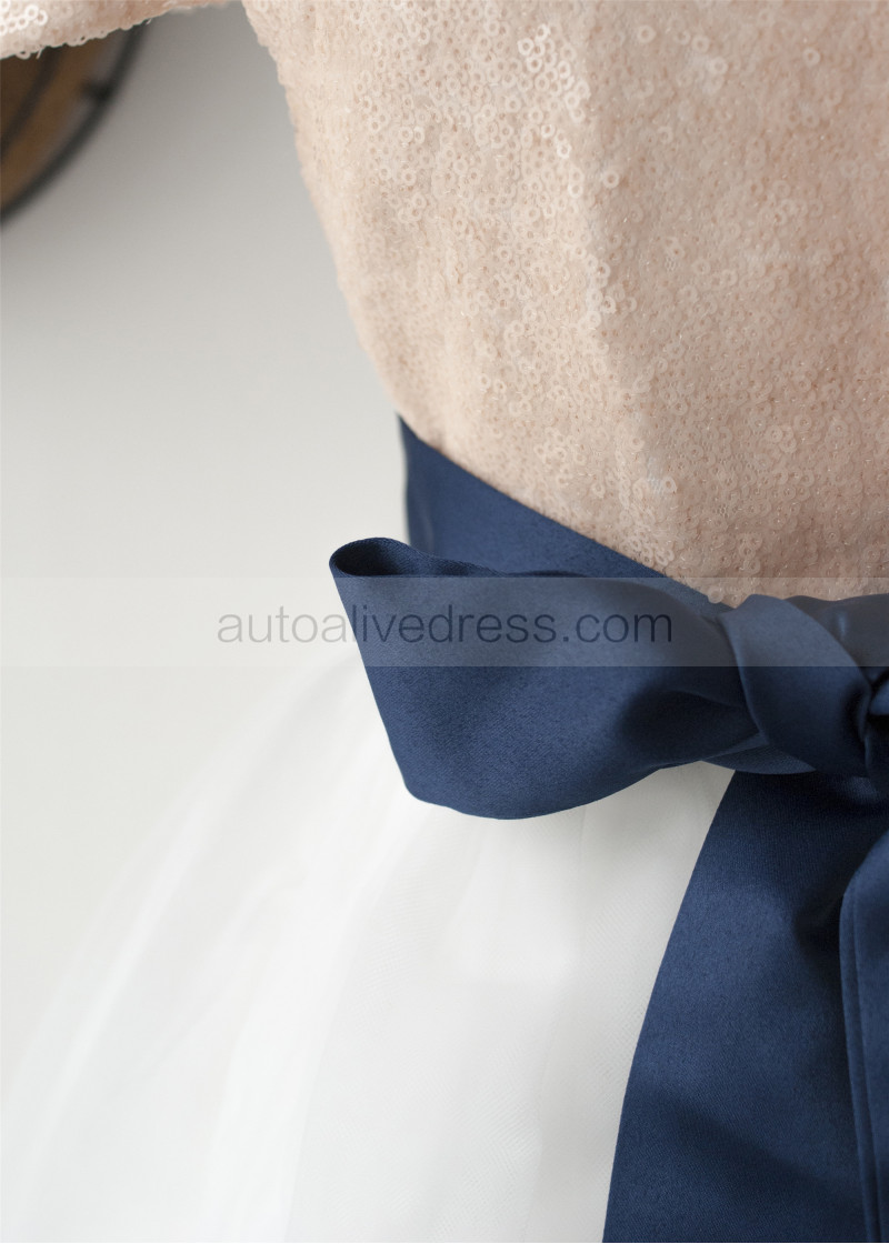 Shown Color | Blush Pink Sequin, Ivory Tulle With Navy Blue Sash |